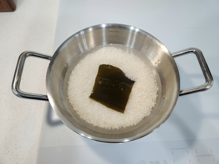 30분간 쌀 3컵, 물 3.6컵, 다시마 넣고 쌀 불리기