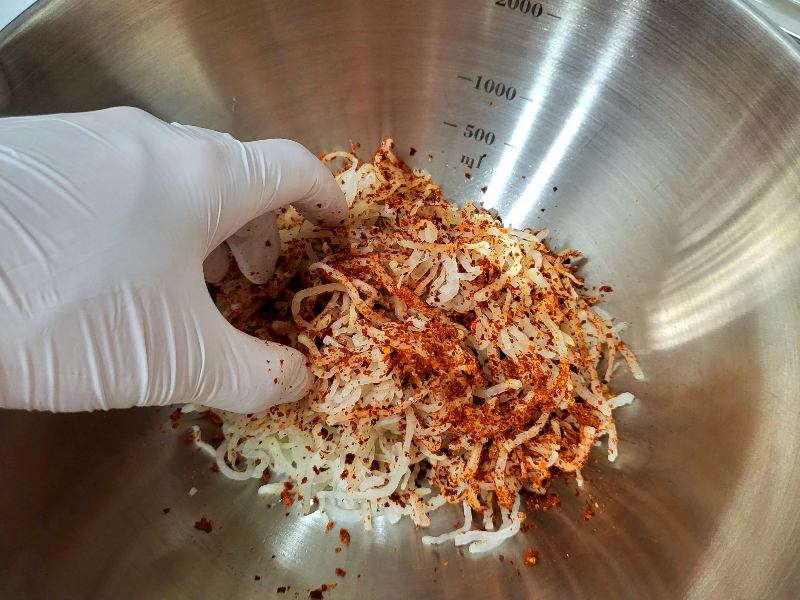 3. 무채에 절임 양념이 골고루 묻도록 눌러주고 나서 절여지도록 10분간 둡니다.