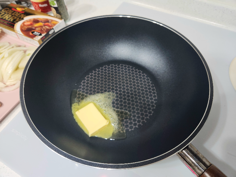 1. 중불로 달군 깊은 팬에 버터 10g과 식용유 3큰술 둘러 버터를 서서히 녹여줍니다.