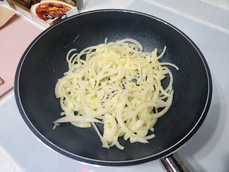 2. 채 썬 양파 1/2개를 팬에 넣고 노릇노릇하게 볶아줍니다.