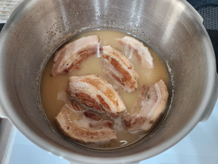 3. 다시 압력솥에 삼겹살을 넣고, 고기가 잠길 만큼 막걸리를 부어줍니다.