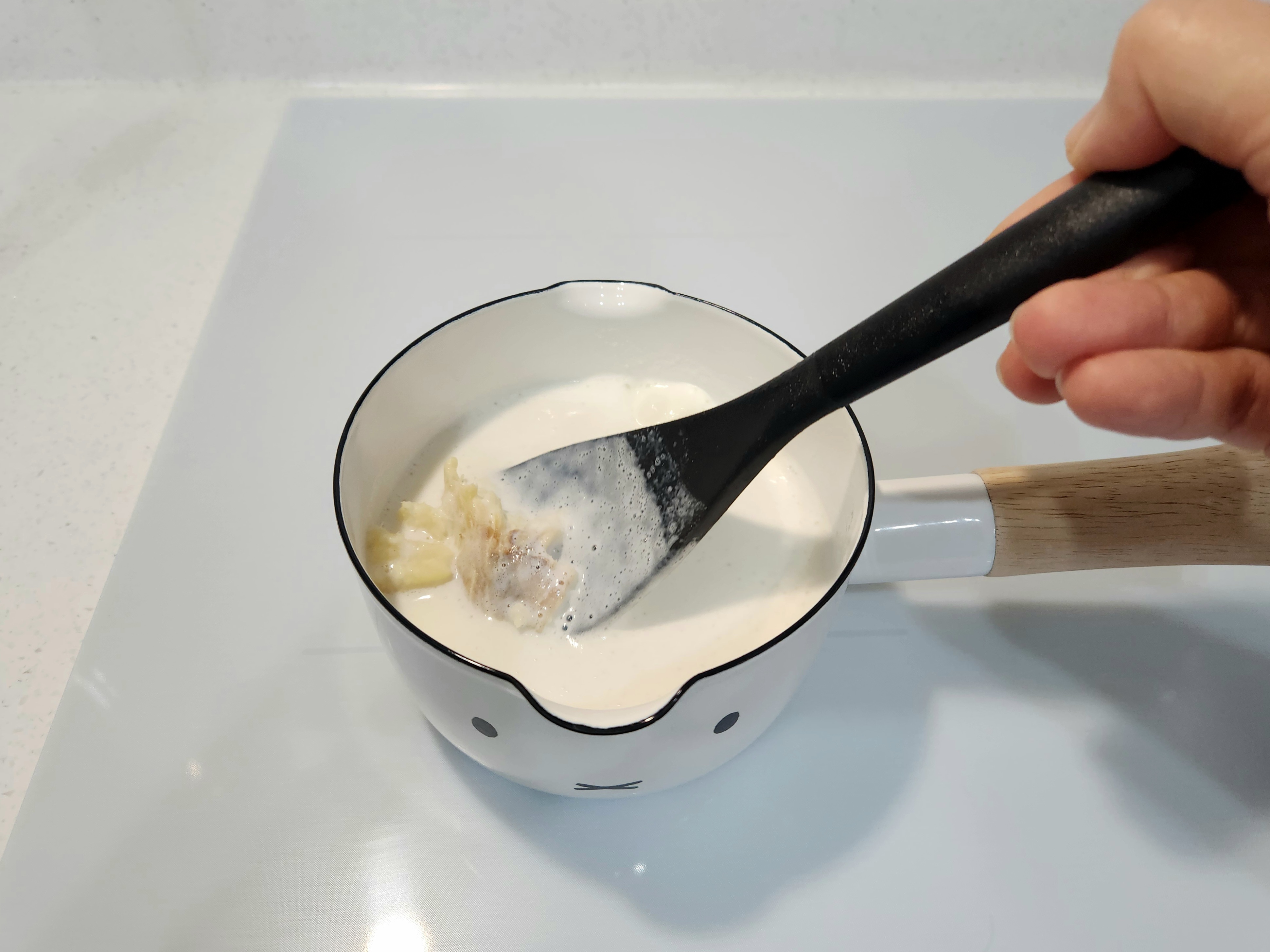 2. 약 5분정도 고구마+우유를 끓이면서 주걱을 이용해 바닥이 눋지 않도록 저어주세요. 동시에, 고구마는 가능한 만큼 으깨어줍니다.