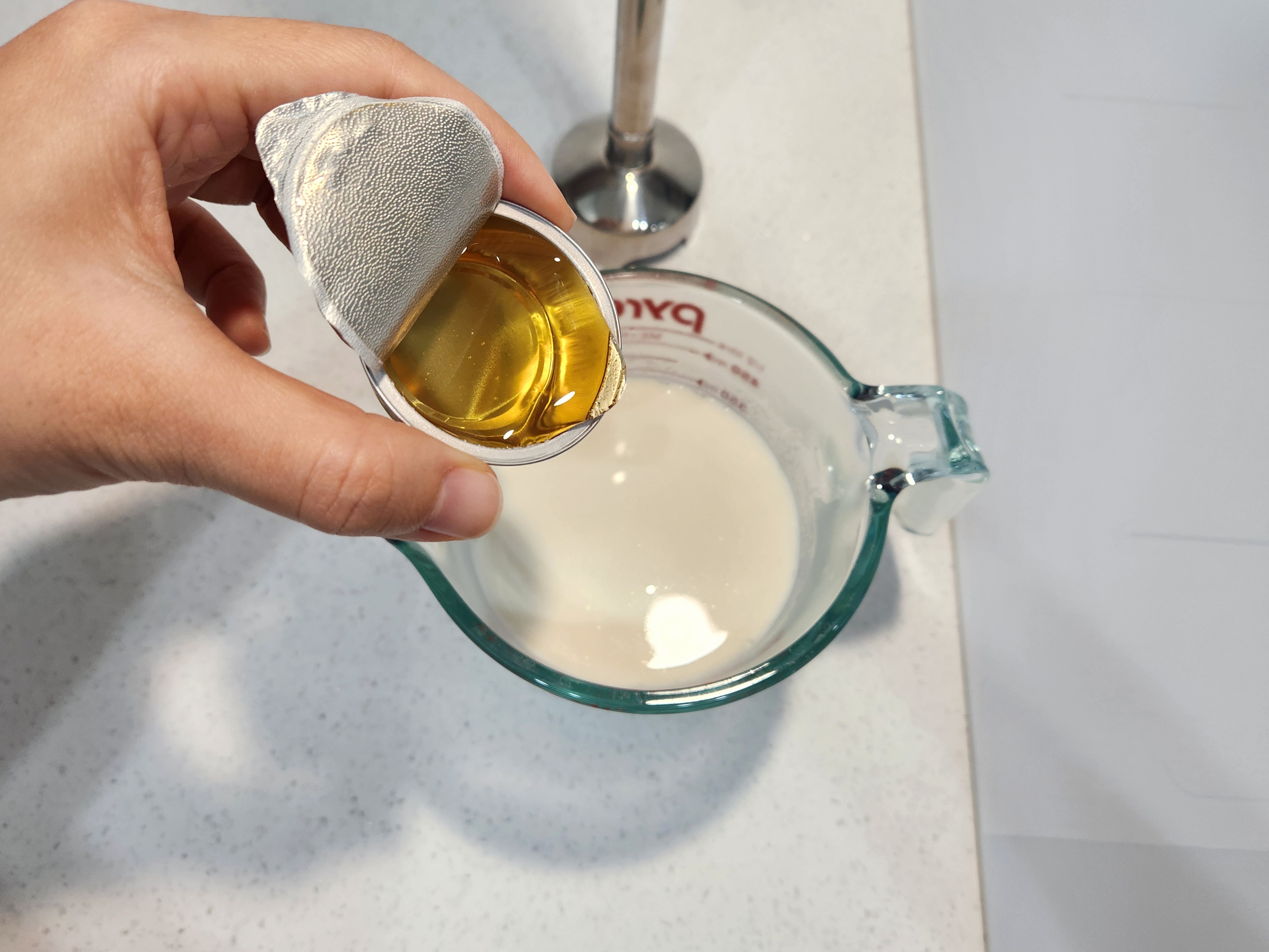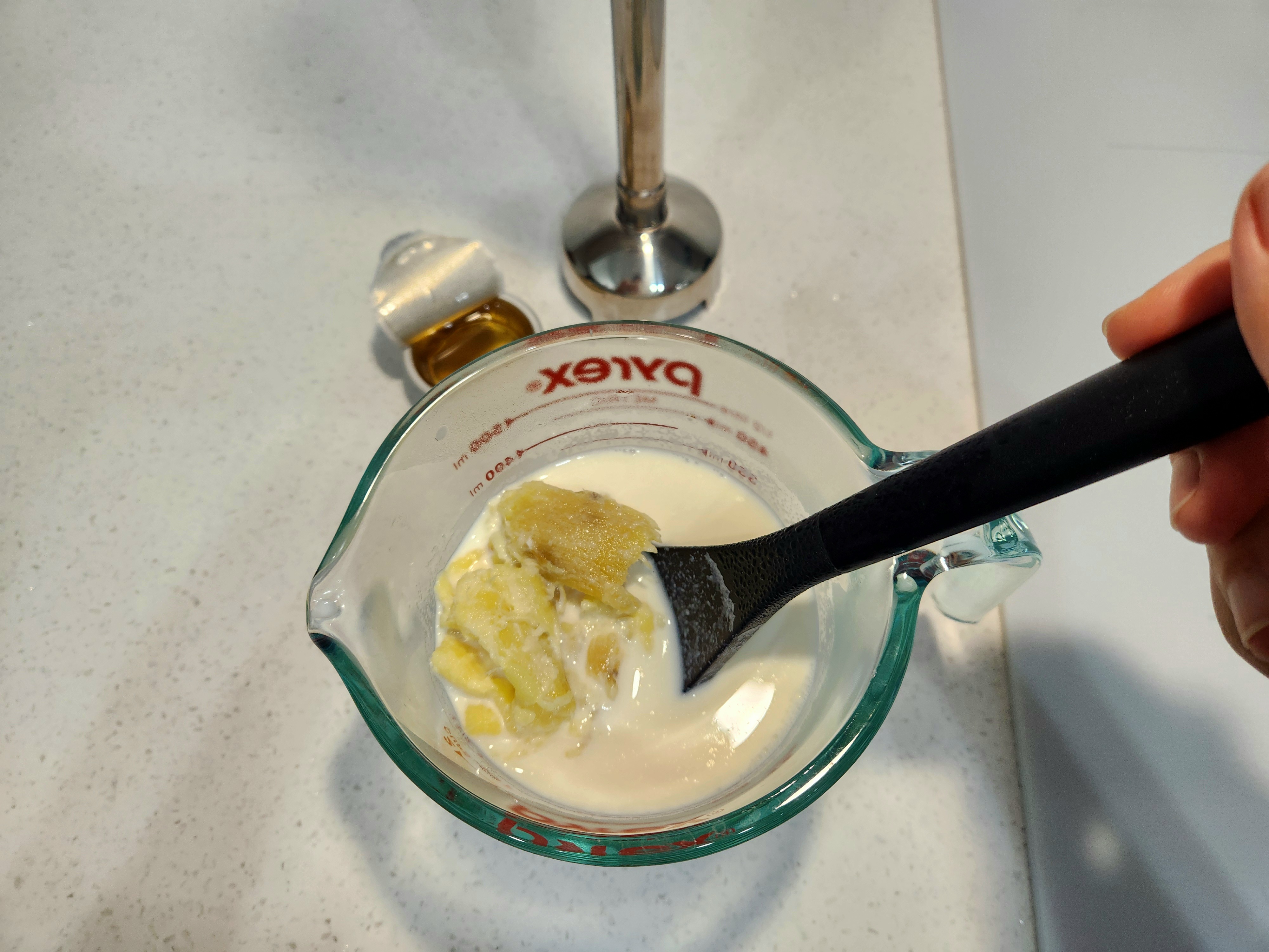 3. 5분 정도 지나 고구마+우유가 따끈따끈하게 데워지면, 믹서 사용 가능한 용기로 옮겨 담고 꿀 2큰술을 넣어주세요.