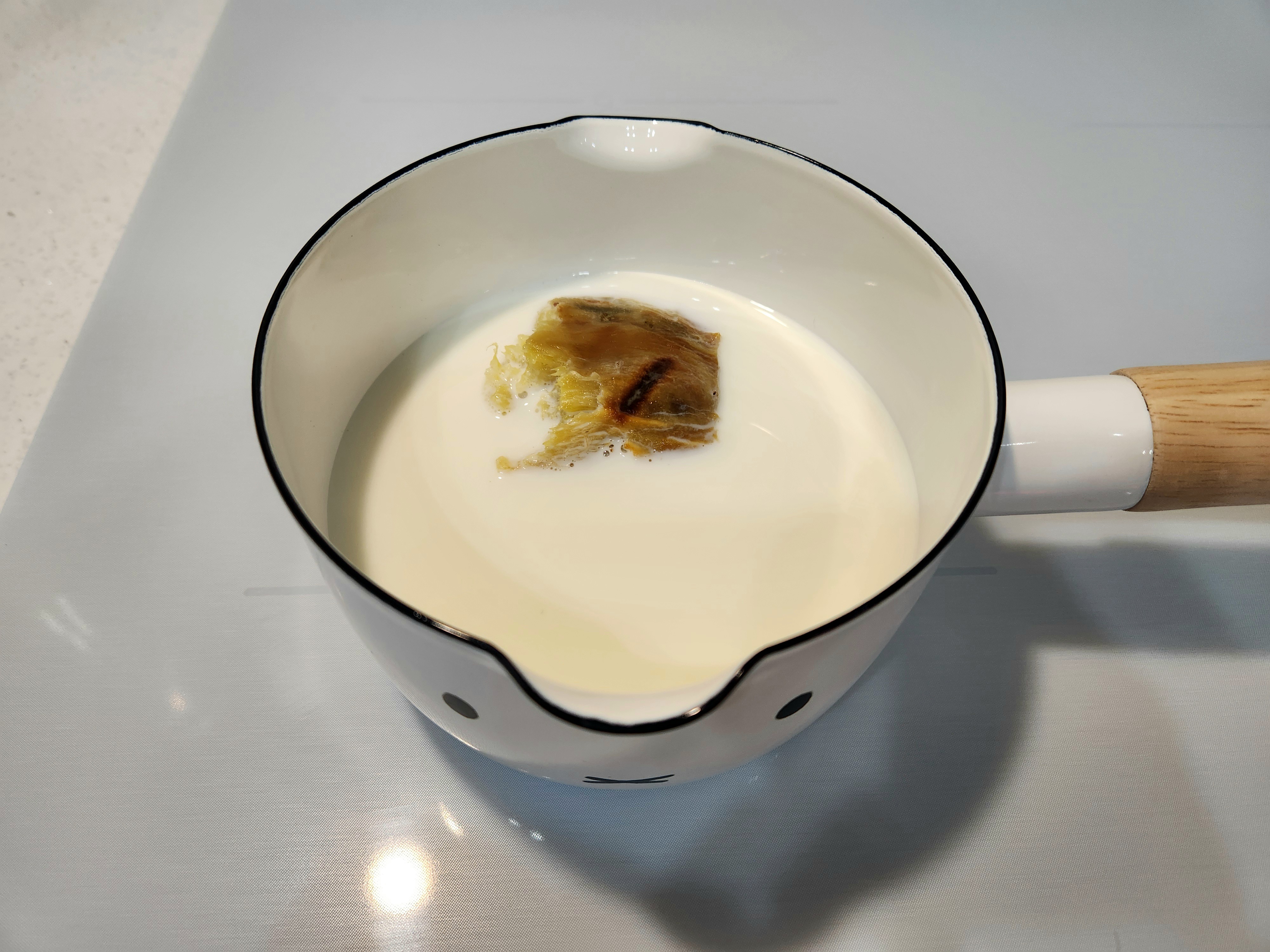 1. 냄비에 우유 300ml와 고구마 100g을 넣고 중불에서 서서히 가열합니다.