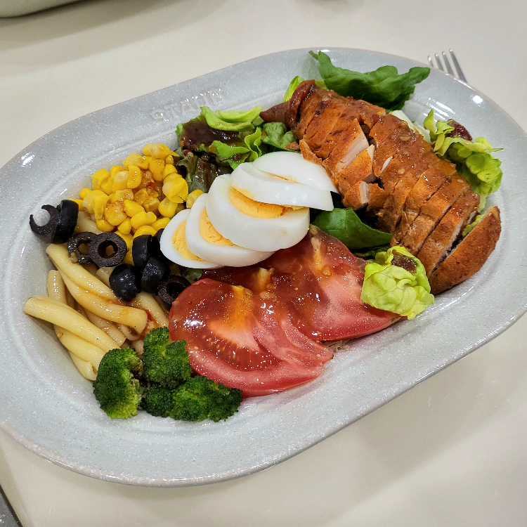 저는 제가 좋아하는 초록잎 풀들을 기본으로 깔고, 콥샐러드 느낌으로, 스위트콘과 블랙올리브, 삶은 달걀, 브로콜리, 토마토, 닭가슴살을 얹은 뒤 부드럽게 삶은 파스타면을 함께 플레이팅 해봤어요.