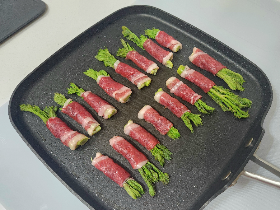 6. 중강불로 데워 식용유를 얇게 바른 프라이팬 위에 5.의 두릅 차돌말이를 얹습니다.