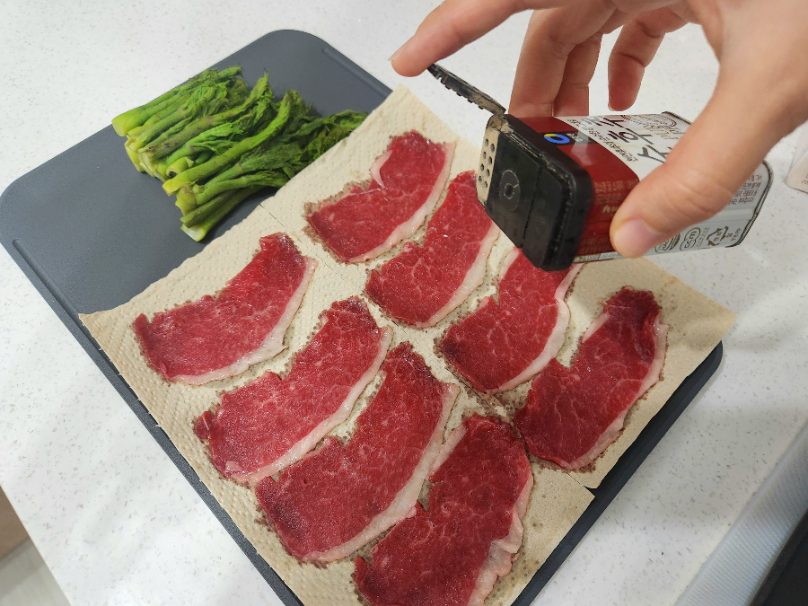 2. 펼친 키친타월 위에 차돌박이를 겹치지 않게 잘 펼쳐주세요.