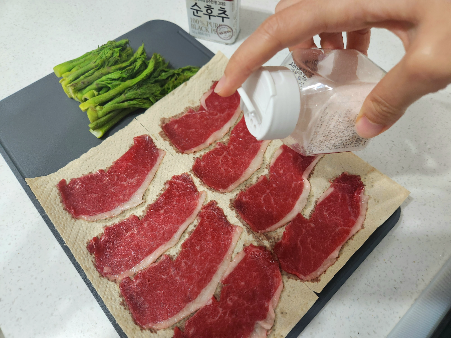 3. 차돌박이 한 장 한 장에 소금과 후추로 약간씩 밑간을 해줍니다.
