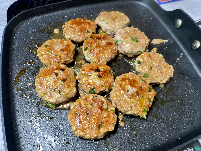 5. 노릇하게 거의 다 익어갈 때쯤, 유장의 재료를 한데 잘 섞어 준비한 뒤, 숟가락이나 솔을 이용해 동그랑땡의 앞뒷면에 골고루 발라 살짝 구워 마무리합니다.