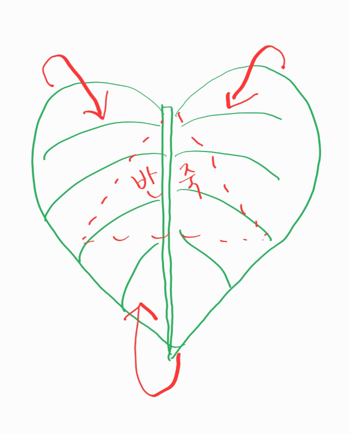 1. 깻잎을 펼쳤을 때, 하트모양으로 보이도록 굵은 줄기 끝이 위를 향하도록 놓습니다.
