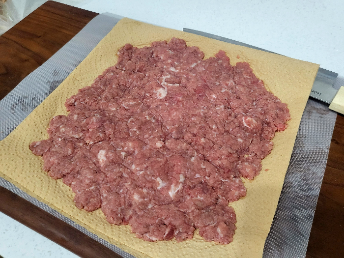 1. 다진 고기류는 누린내를 줄이기 위해, 키친타월을 이용해 핏물을 꾹꾹 제거해 줍니다.