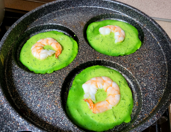 6. 반죽 아랫면 가장자리가 진한 초록색을 띠며 익어가는 느낌이 들 때, 바로 뒤집어 윗면의 새우와 반죽이 잘 붙도록 익혀줍니다.