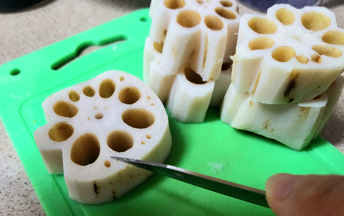 2. 익혀낸 연근의 구멍 근처 두꺼운 부분을 조각하듯 세로로 잘라내줍니다.