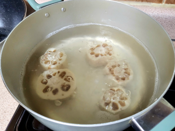 1. 생연근을 4~5cm 두께로 썰어서 끓는 물에 5분간 익힙니다.