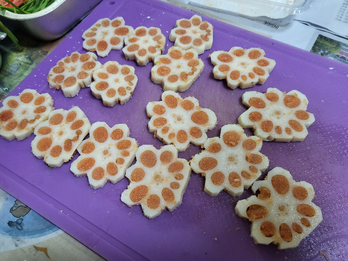 생각보다 연근에 꽃모양 내기가 어렵지 않아요. 굳이 모양을 안 내고 그냥 명란전으로 만들어도 되지만, 꽃모양을 내면 눈으로 보는 즐거움도 있지요.^^