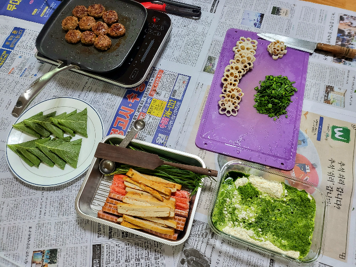 저는 이번에, 전 종류별로 겹치는 재료들이 있게끔 재료를 준비했어요. 부추를 부추새우전과 오색꼬지전에 썼고, 떡갈비 재료로 떡갈비 동그랑땡과 깻잎전에 썼어요. 이렇게 준비하니 재료 준비에서 수고를 덜고, 재료가 많이 남지 않아 좋았어요.