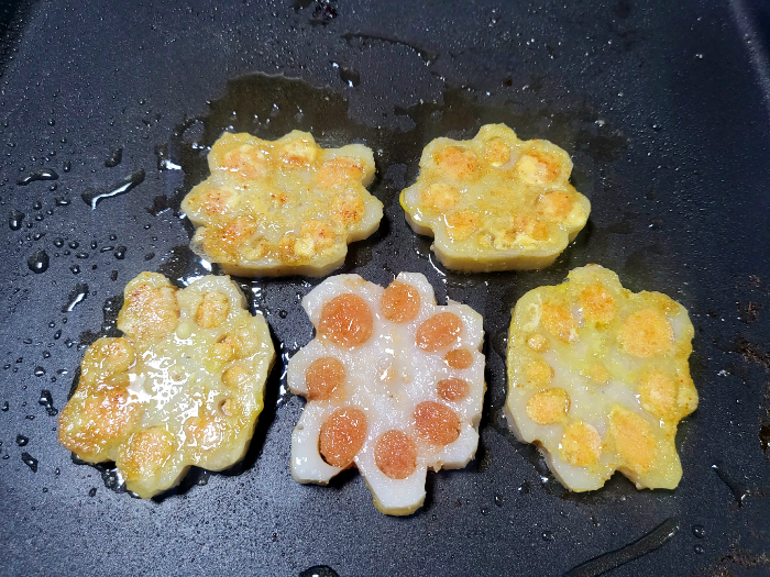 * 연근전의 양면을 달걀물로 덮으면 구멍에 채운 명란이 전혀 보이지 않을 것 같아서 한쪽 면에만 달걀물을 묻혀 구웠습니다.