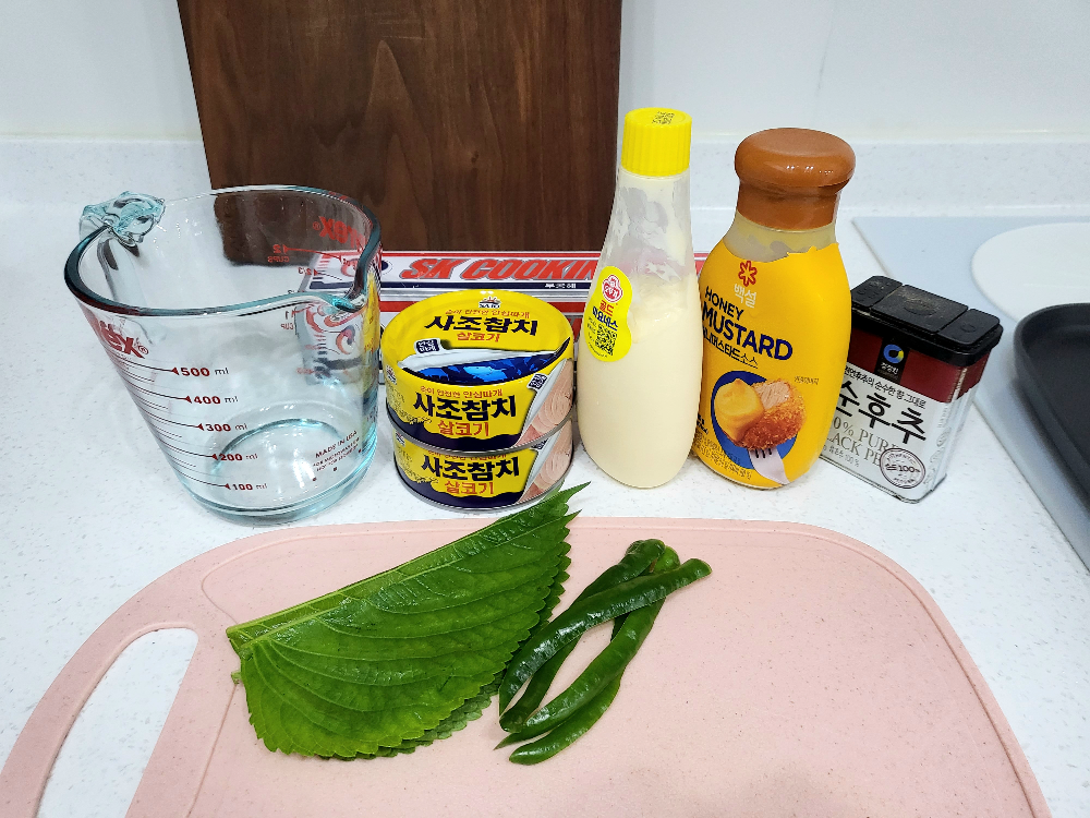 2인분 기준으로, 참치캔 (135g/개) 2개, 밥 2 공기, 김 4장, 깻잎 4장, 씻은 묵은지 2 잎, 마요네즈 5큰술, 머스터드소스 1 티스푼, 청양고추 2개, 참기름 2큰술, 소금 4꼬집, 통깨, 후추 준비하시면 됩니다.