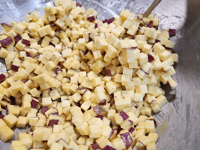 2. 0.5~0.7cm 정도의 고구마 큐브 모양으로 썰어주세요.