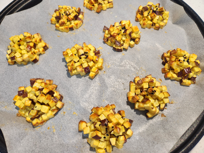 4. 오븐용기 혹은 팬에 내열 종이호일을 깔고, 숟가락으로 크게 한 스푼씩 고구마큐브 반죽을 떠서 띄엄띄엄 놓습니다.