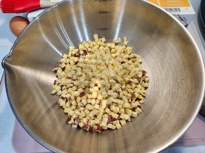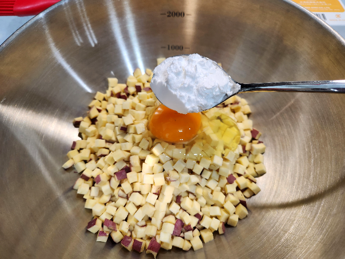 3. 넉넉한 볼에 큐브형으로 썬 고구마를 모두 담고, 달걀 1개, 전분 2큰술, 소금 1꼬집 넣어 숟가락으로 휘휘 섞어주세요.