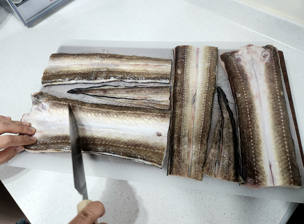 * 장어살에 칼집을 낼 때, 가볍게 밀어주듯이 슥슥 해주시면 되는데, 간혹 칼이 걸리는 센 뼈 부분은 조금 더 힘을 줘서 톡 소리가 나게 끊어주시면 됩니다.