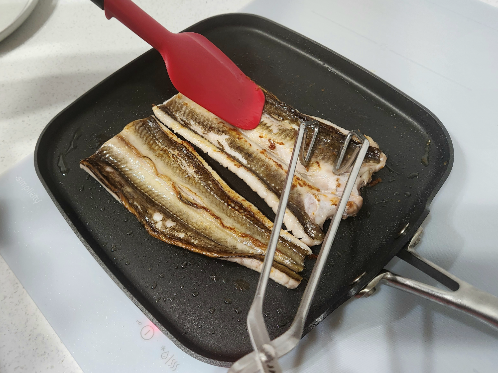 7. 두툼한 살 부분이 잘 익도록 봐주면서 앞뒤로 잘 익혀 가위로 썰어 담아내면 됩니다.