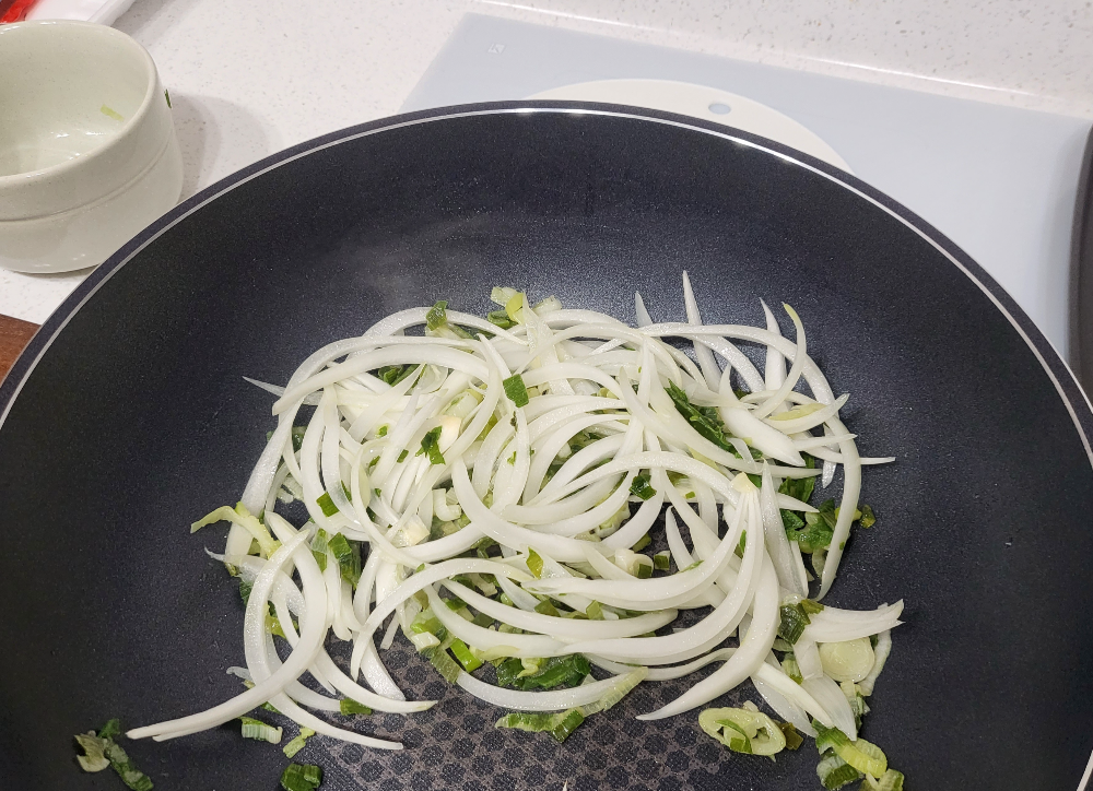 2. 은은한 파향이 올라오면, 프라이팬에 썰어놓은 양파를 넣고 양파의 색깔이 반정도 투명해질 때까지 볶습니다.