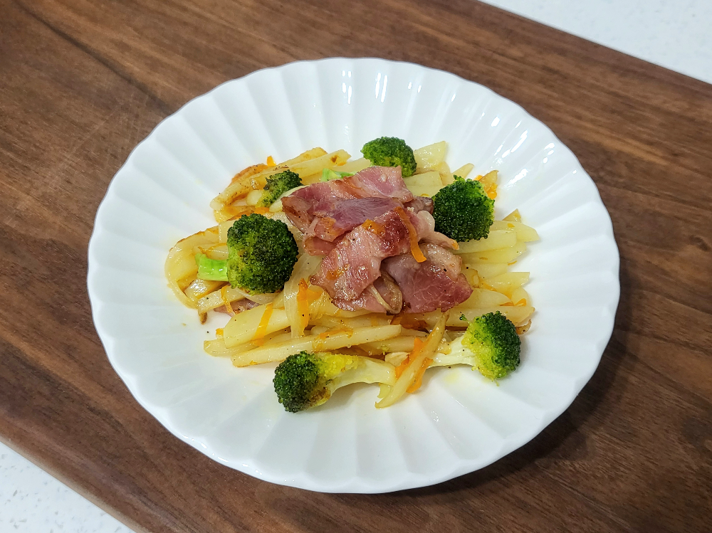 그래서 일단, 부드러운 식감보다는 좀 더 바삭한 식감의 감자채볶음을 하기 위해 수분이 많이 나오는 양파는 최소화했어요. 또, 어른이 식단에서 고기나 햄을 빼놓을 수 없죠! 감칠맛 가득한 베이컨을 추가합니다. 그리고, 이 탄수화물과 단백질과 지방으로 가득한 메뉴에 브로콜리를 딱 넣어 영양적인 면에서도 균형 잡힌 요리를 만들어보겠습니다.