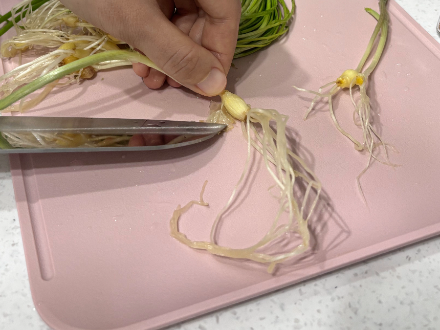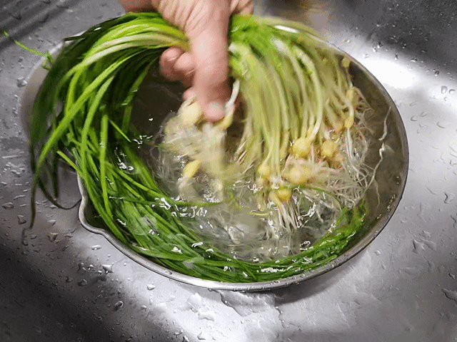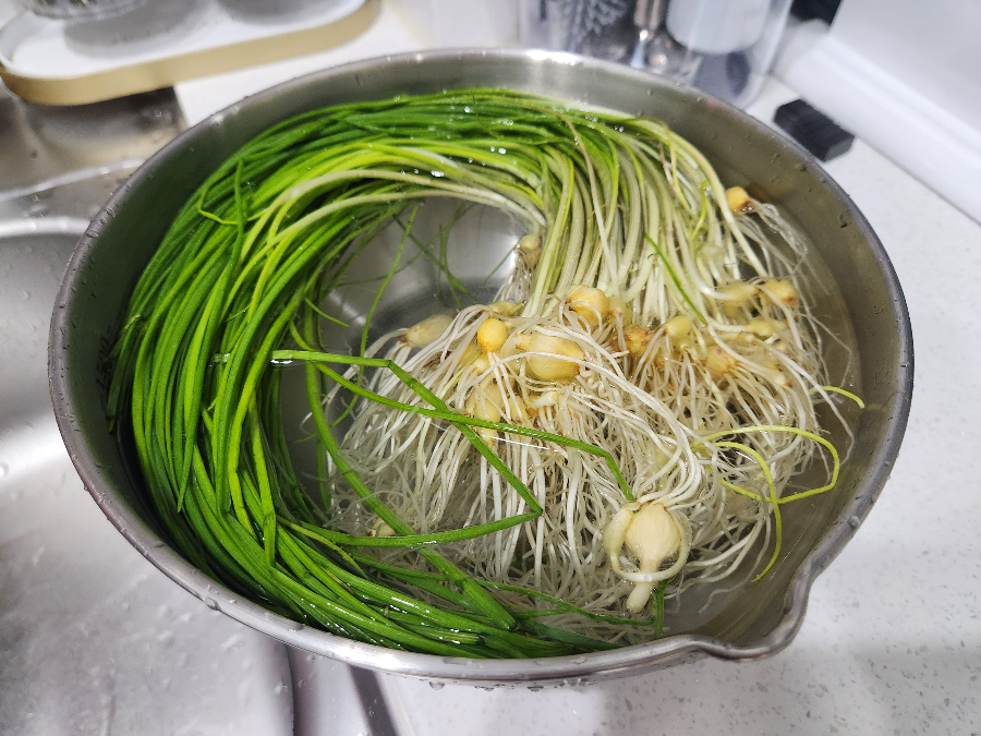먼저, 달래를 묶음으로 쥐고, 뿌리 쪽 흙이 잘 씻겨나가도록