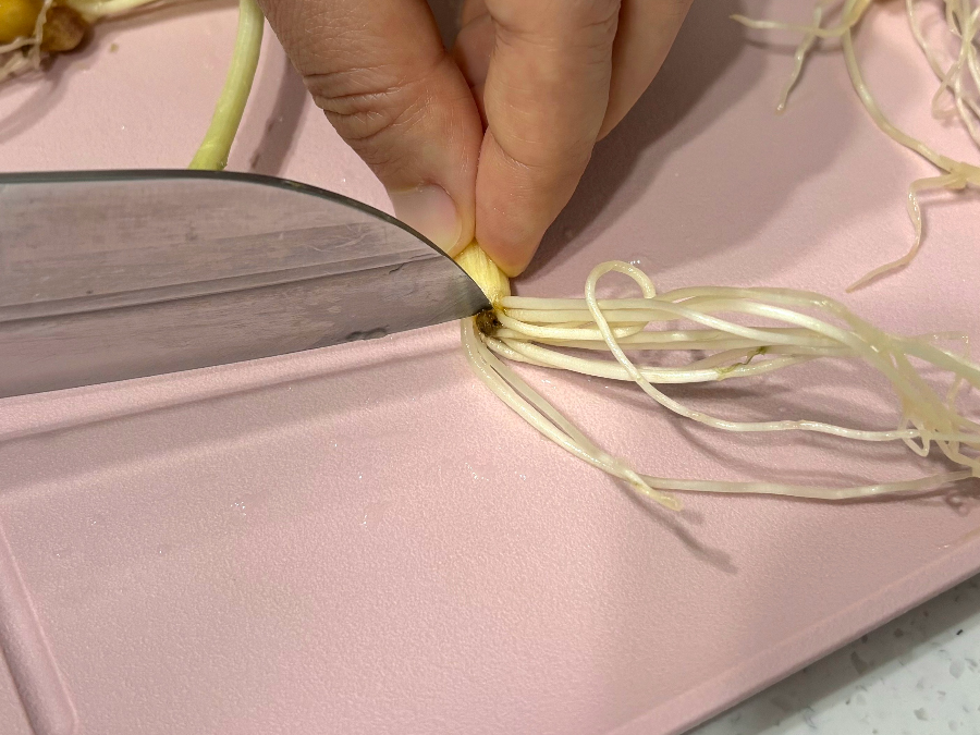또, 달래 뿌리쪽을 보시면, 흙색깔의 뭉치가 있습니다.
