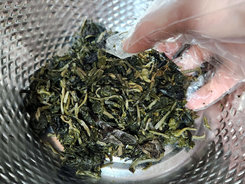 5. 압력이 다 빠진 솥에서 곤드레나물을 꺼내 찬물로 헹군 뒤 물기를 꽉 짜주세요.