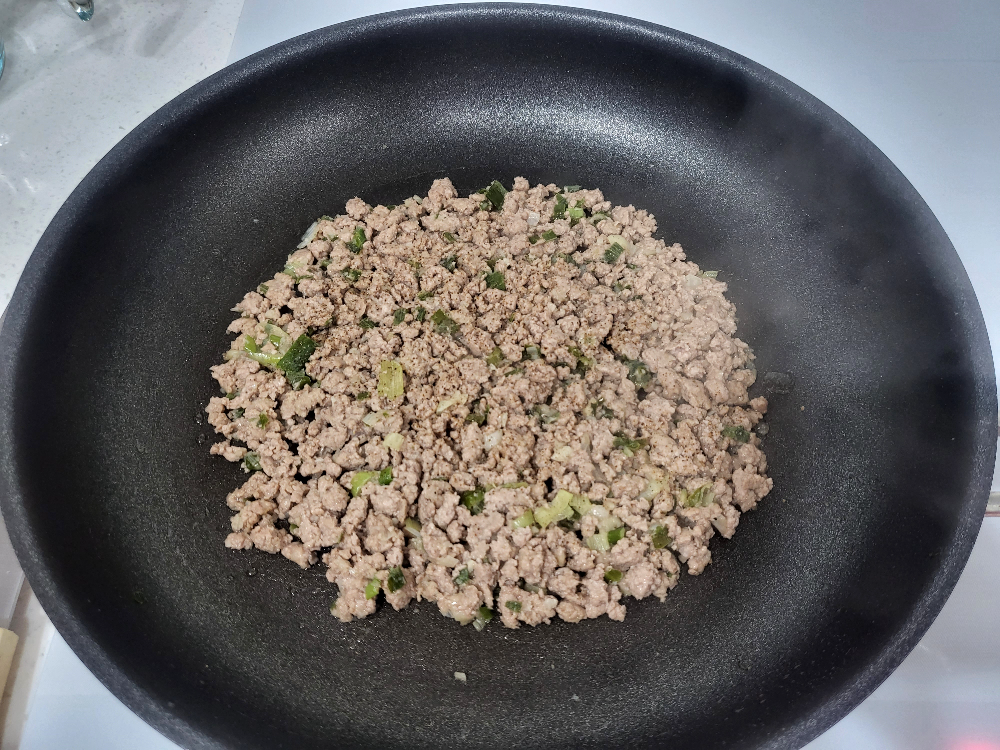 4. 마늘과 대파가 노릇하게 변하고 향이 고소하게 올라올 때쯤 다진 소고기와 식용유 2큰술, 미림 2큰술을 넣어 중강불로 볶습니다. 이때 소고기가 뭉치지 않도록 볶음주걱을 세워 으깨듯 볶아줍니다.