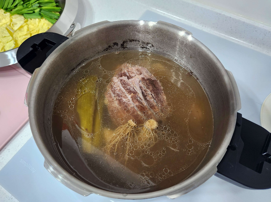 4. 압력솥의 추가 돌아가기 시작하면, 중불로 낮추어 15분간 더 삶습니다.