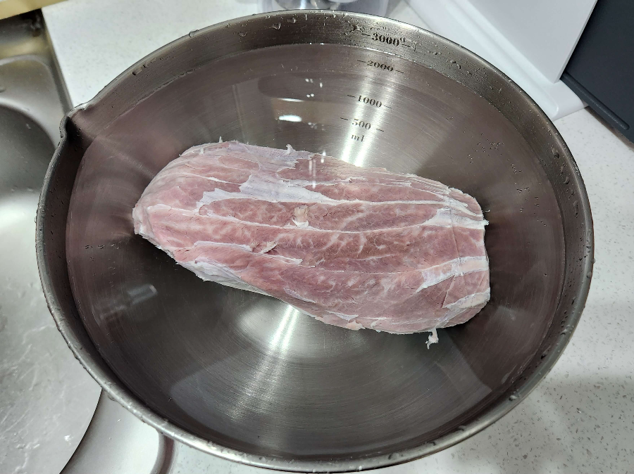 1. 아롱사태를 찬물에 담가 1시간 이상 핏물을 빼줍니다. 중간중간 물을 갈아주면 더 좋아요.
