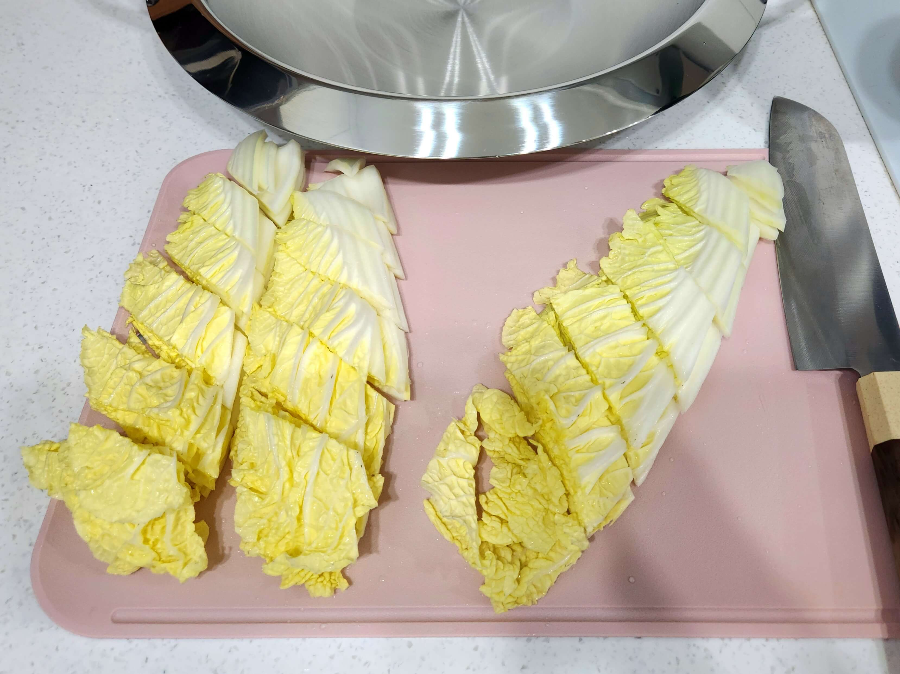 7. 먼저, 전골팬 바닥에 깔아 줄 알배추와 부추를 깨끗이 씻어 한 입 크기로 썰어줍니다.
