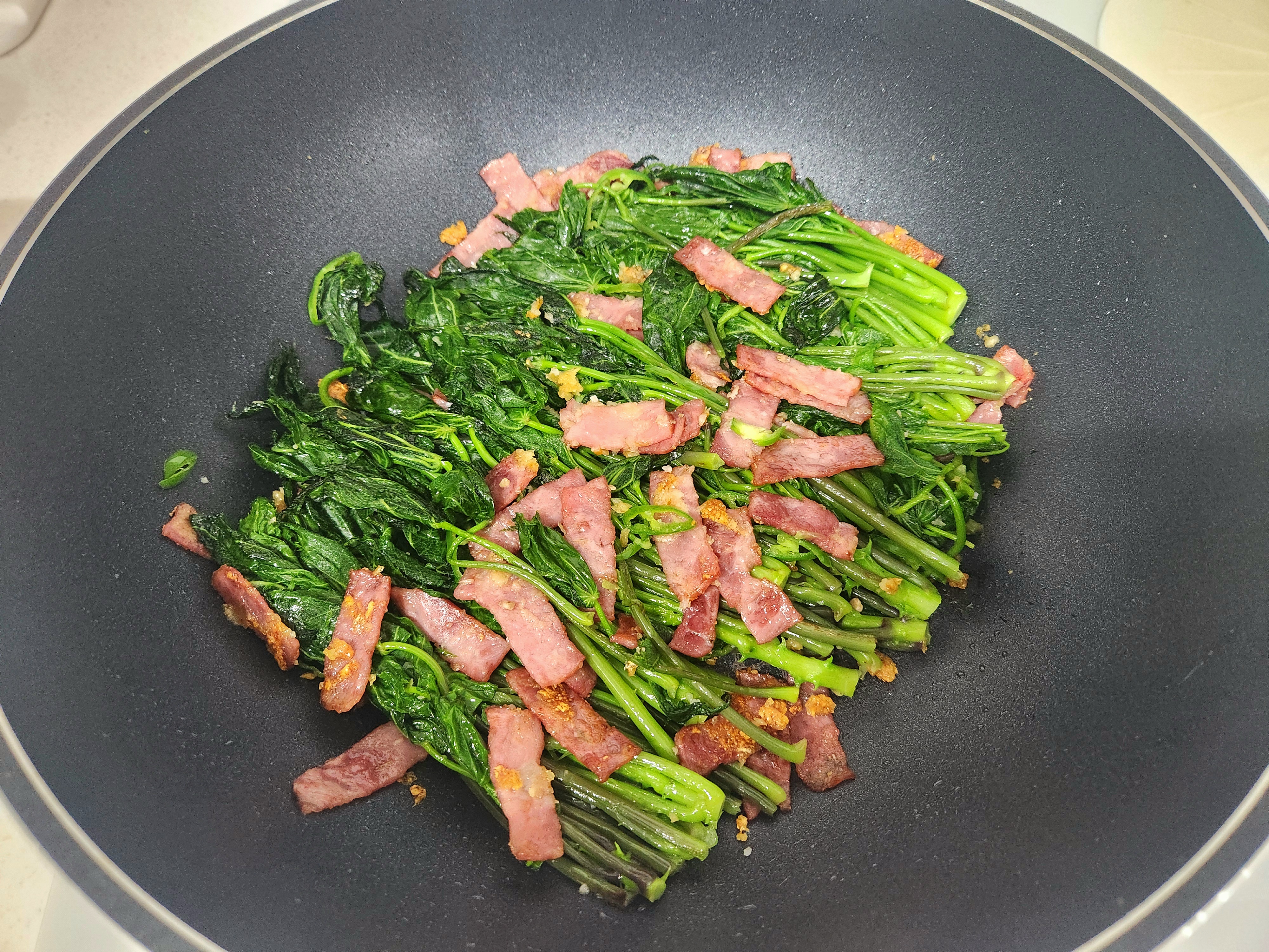 베이컨 다진마늘을 가볍게 볶은 뒤 데친 개두릅을 넣어 다 같이 섞듯 볶기
