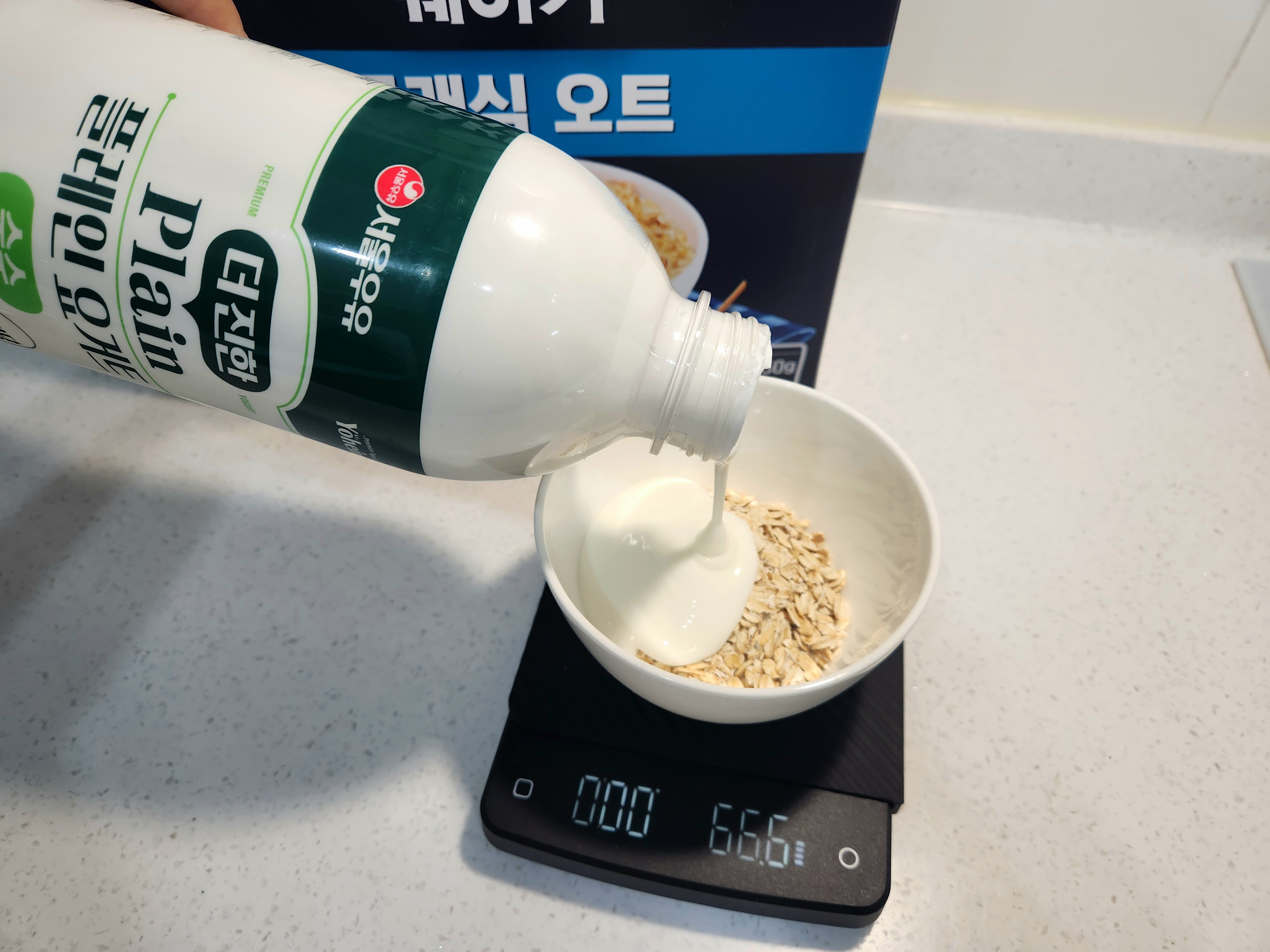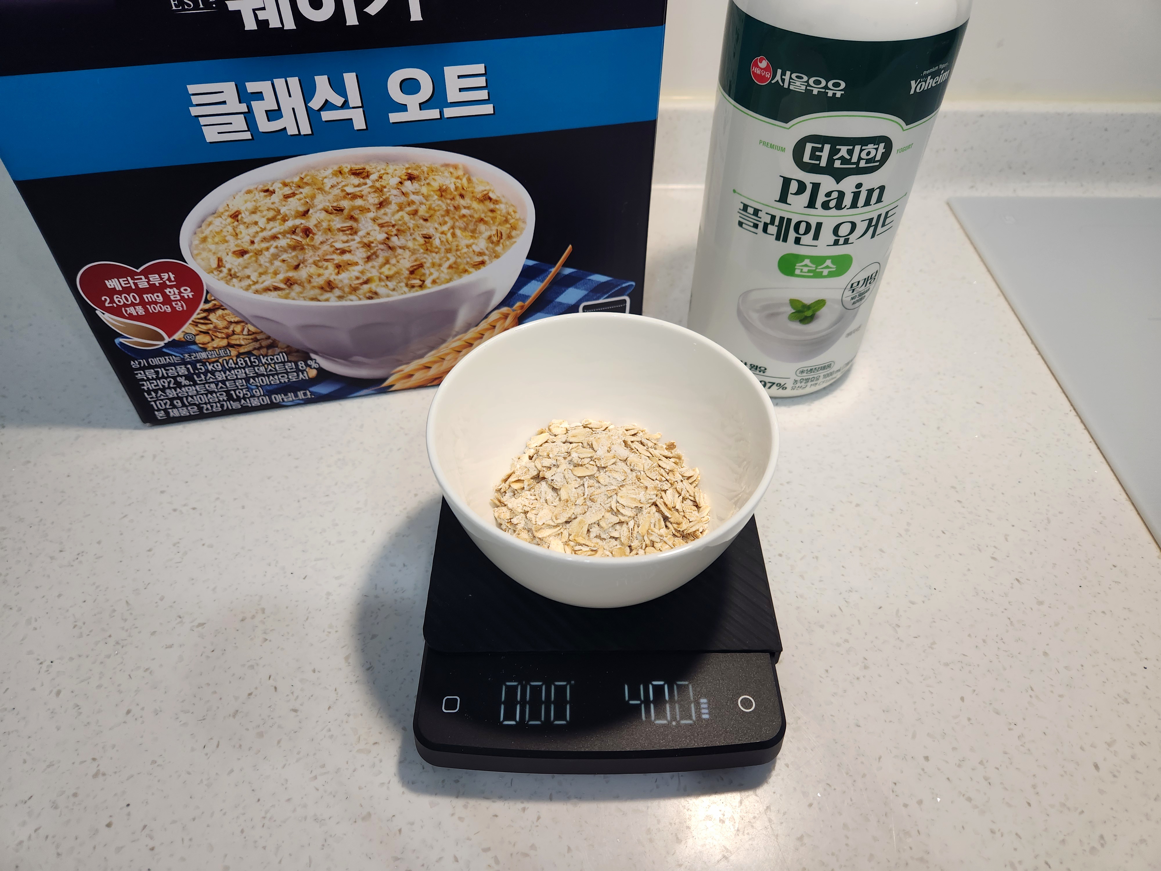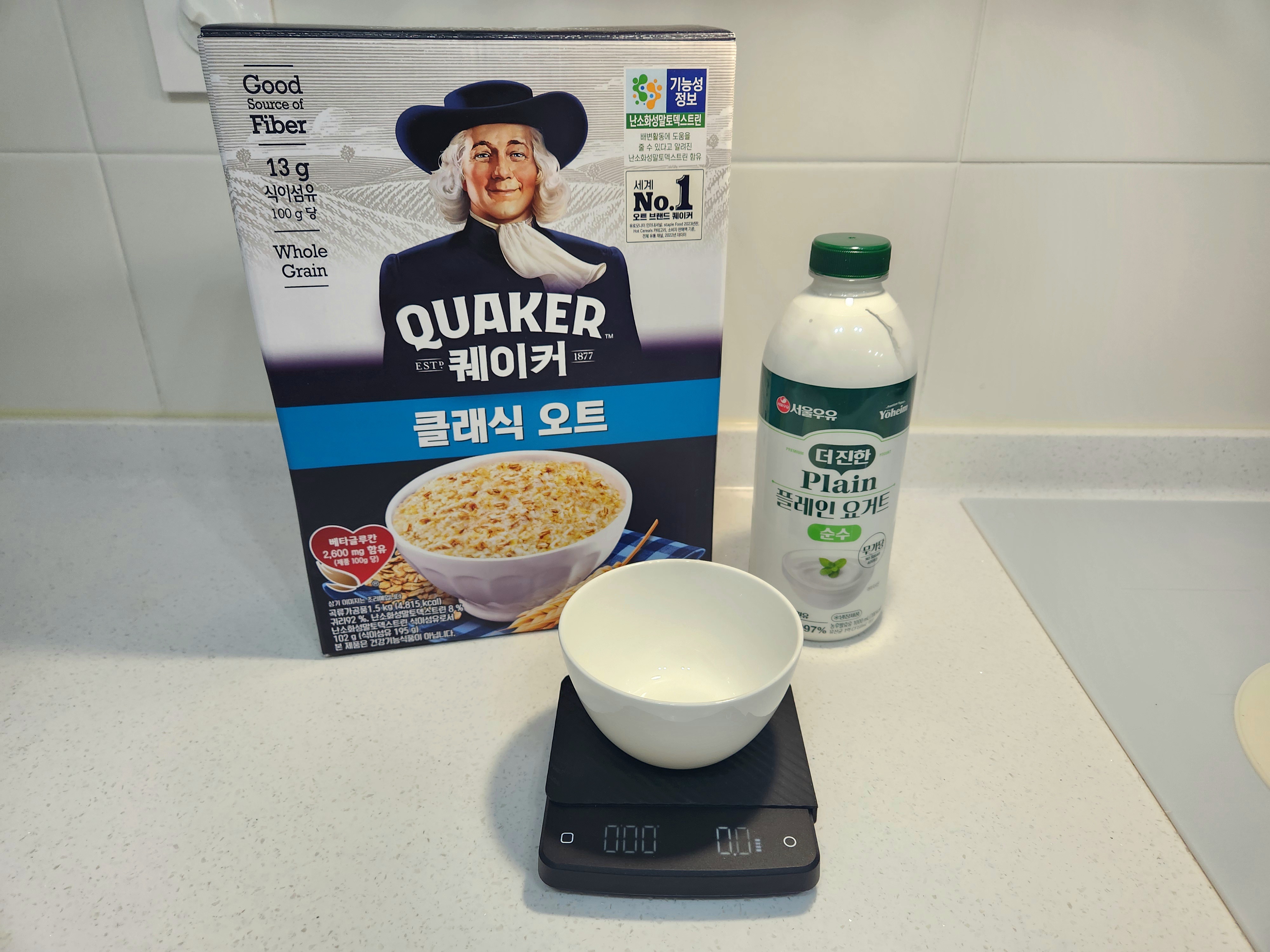 오트밀과 달지 않은 드링킹요거트를 준비합니다.
