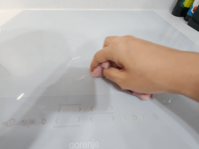 베이킹소다를 누르듯 문질러 얼룩을 닦습니다.