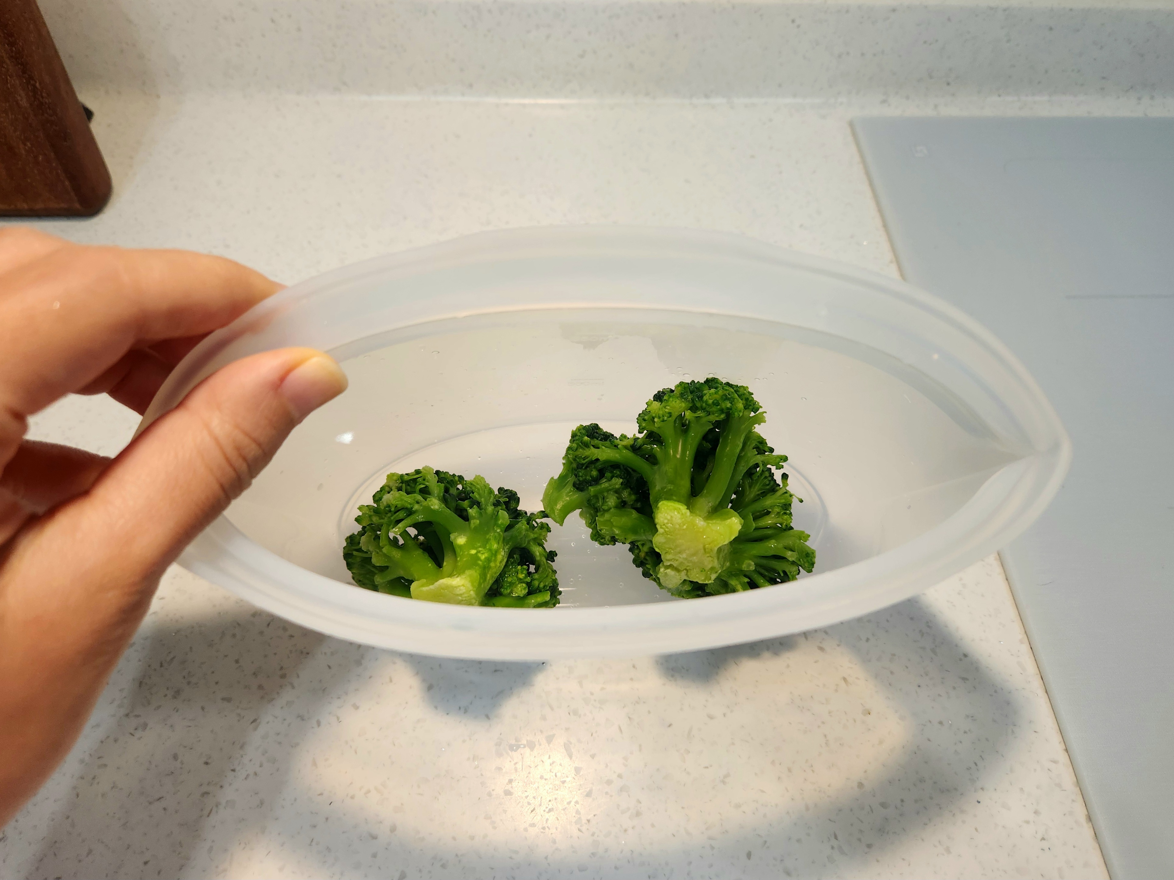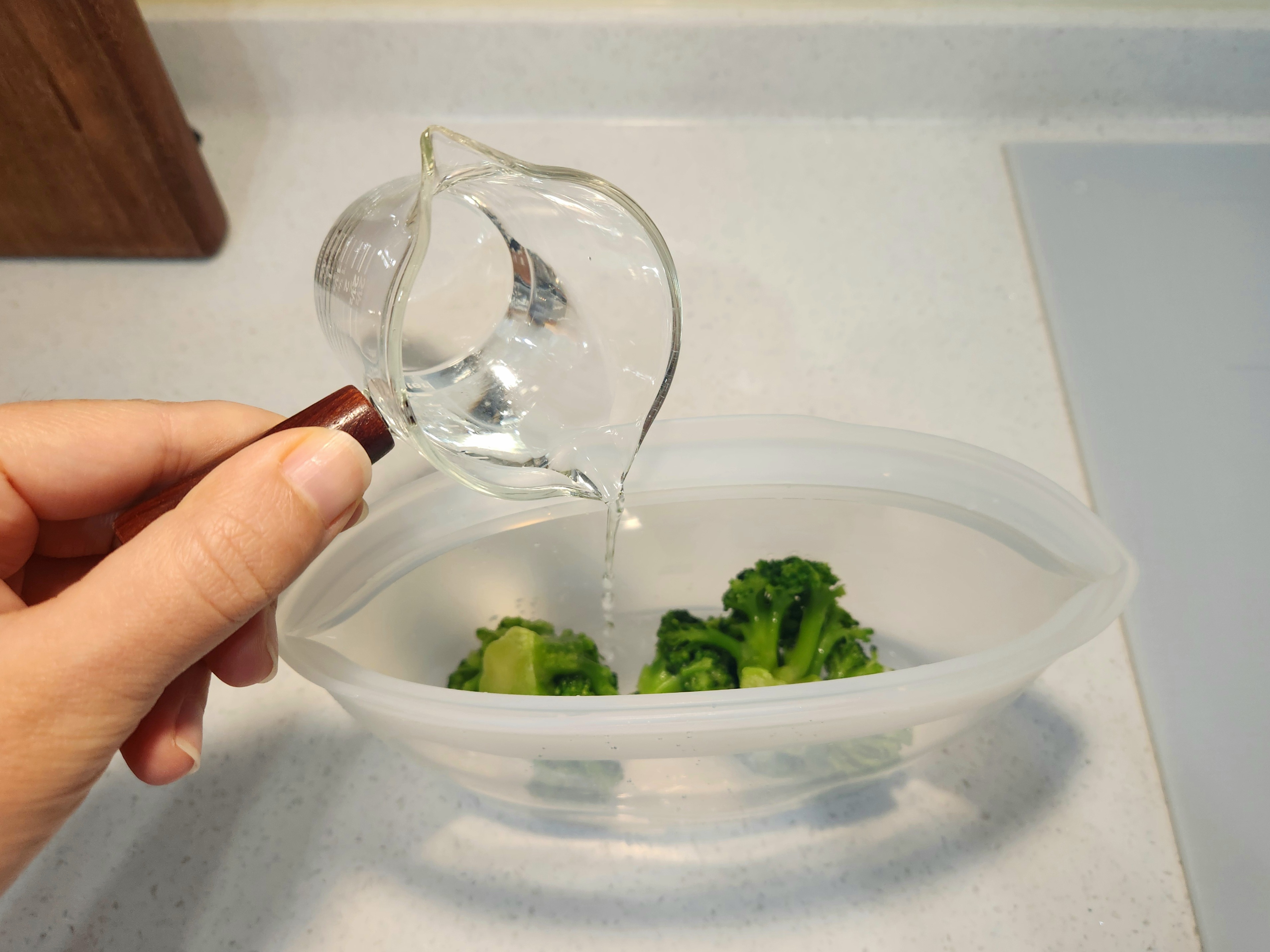3. 냉동 브로콜리를 담은 용기에 4~5 큰술 정도의 물을 넣습니다.