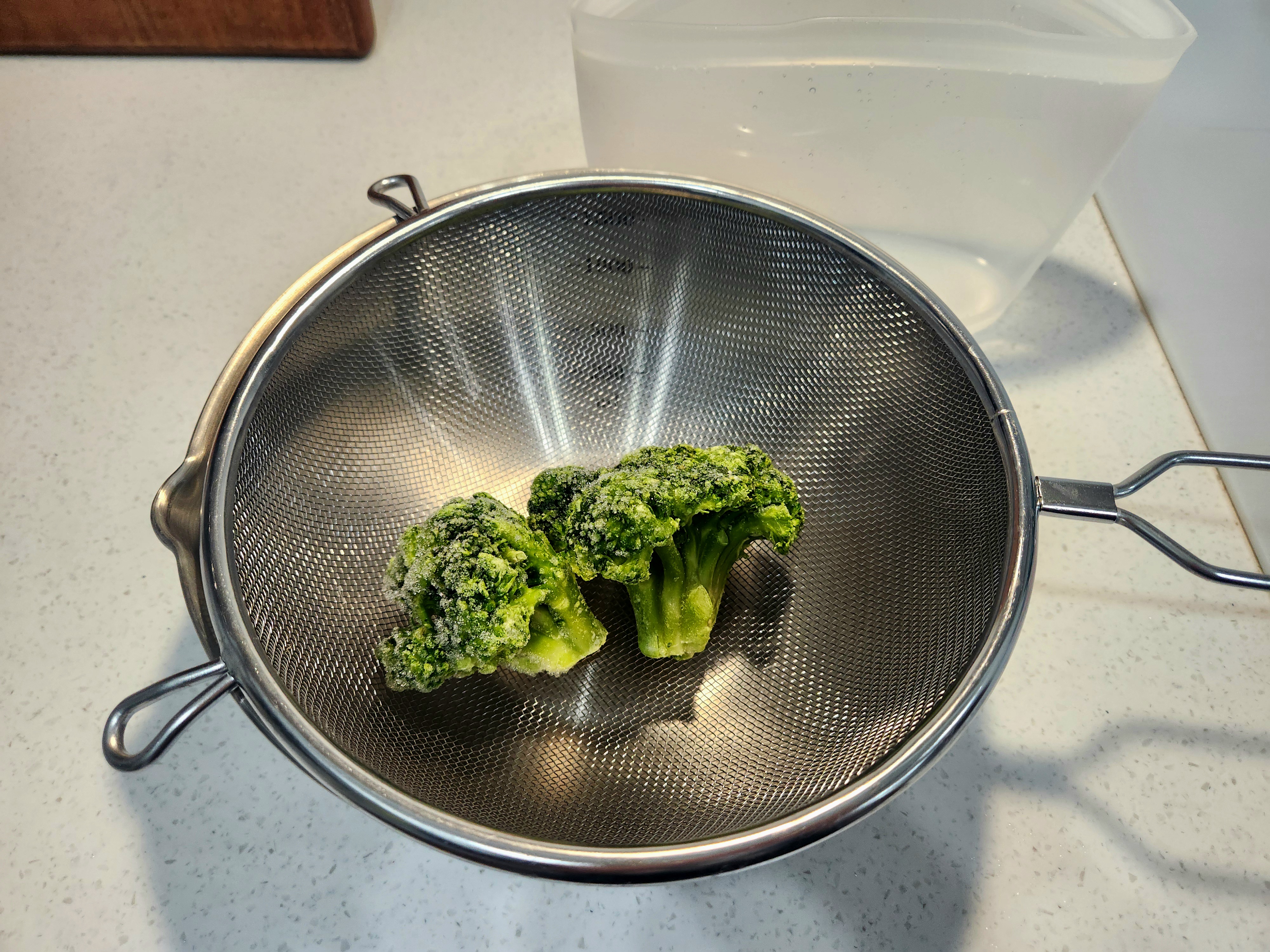 1. 냉동실에서 꺼낸 냉동 브로콜리를 물에 헹구어 준비합니다.