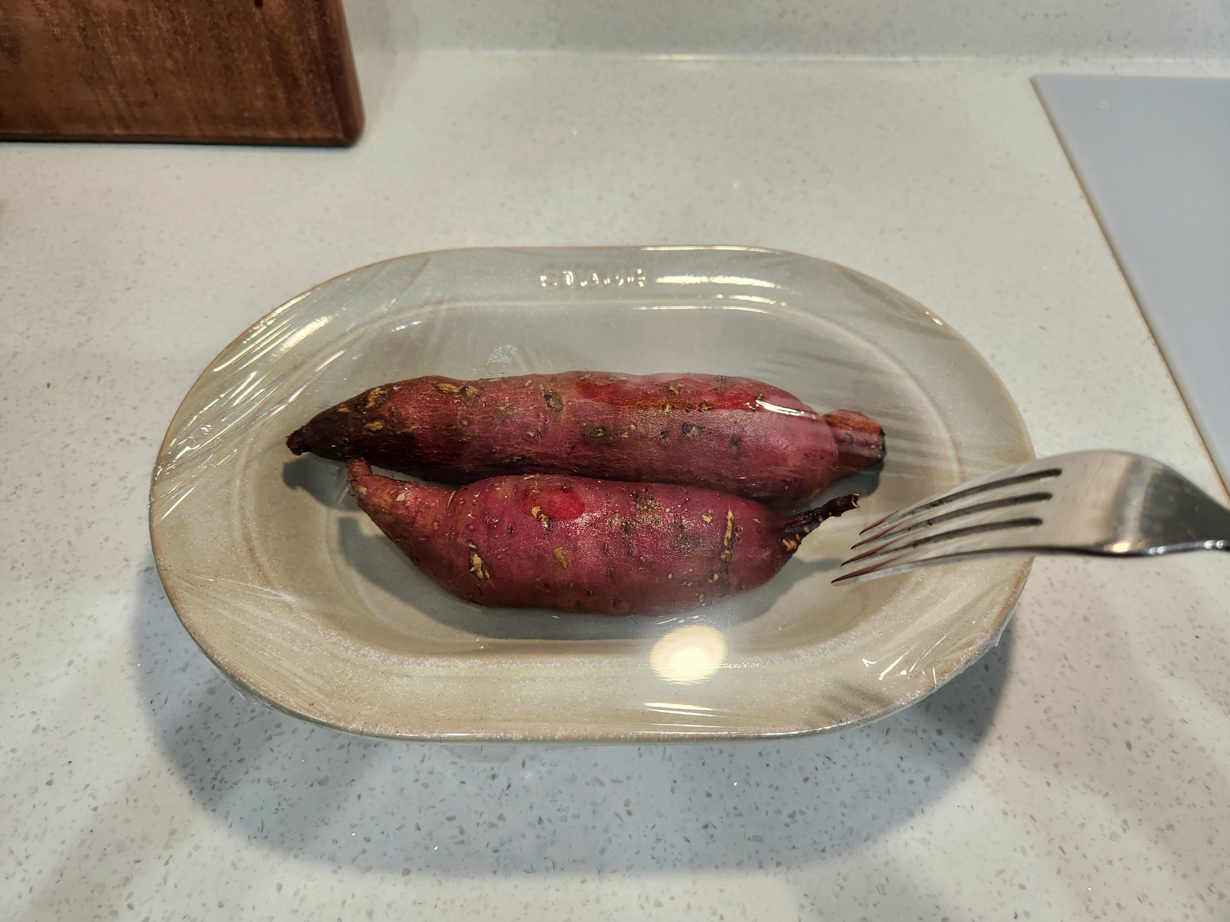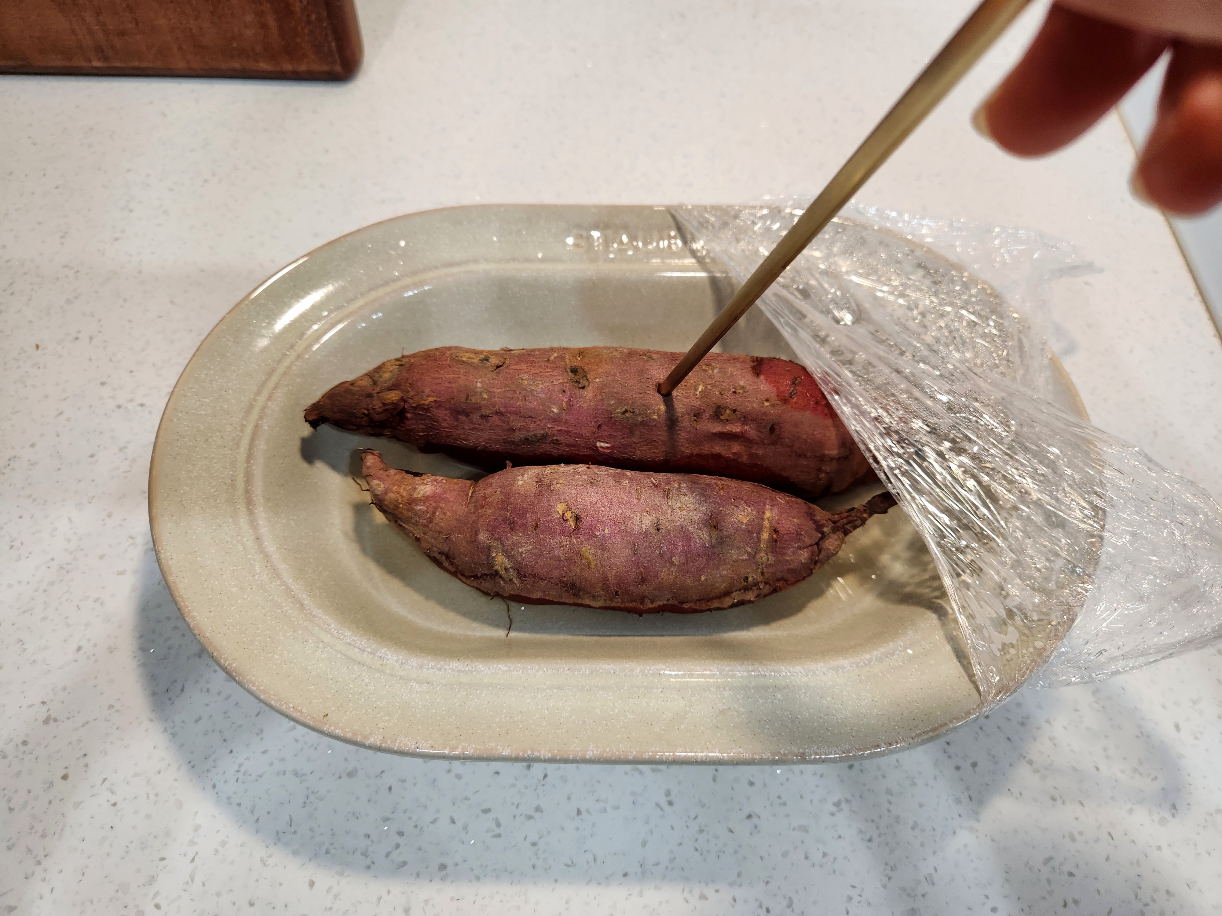 2. 고구마와 물이 담긴 용기를 비닐랩으로 덮고, 포크를 이용해 수증기 구멍을 5~6개 정도 내어 줍니다.