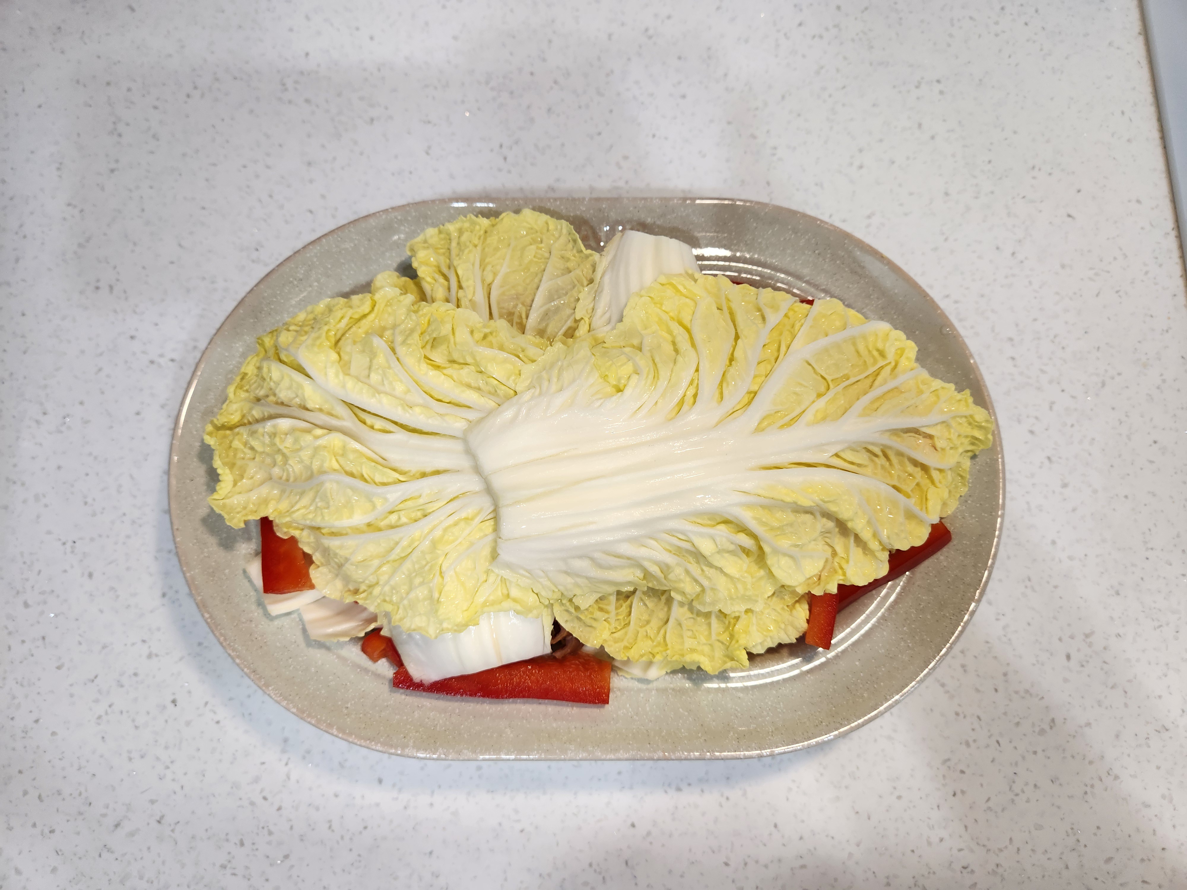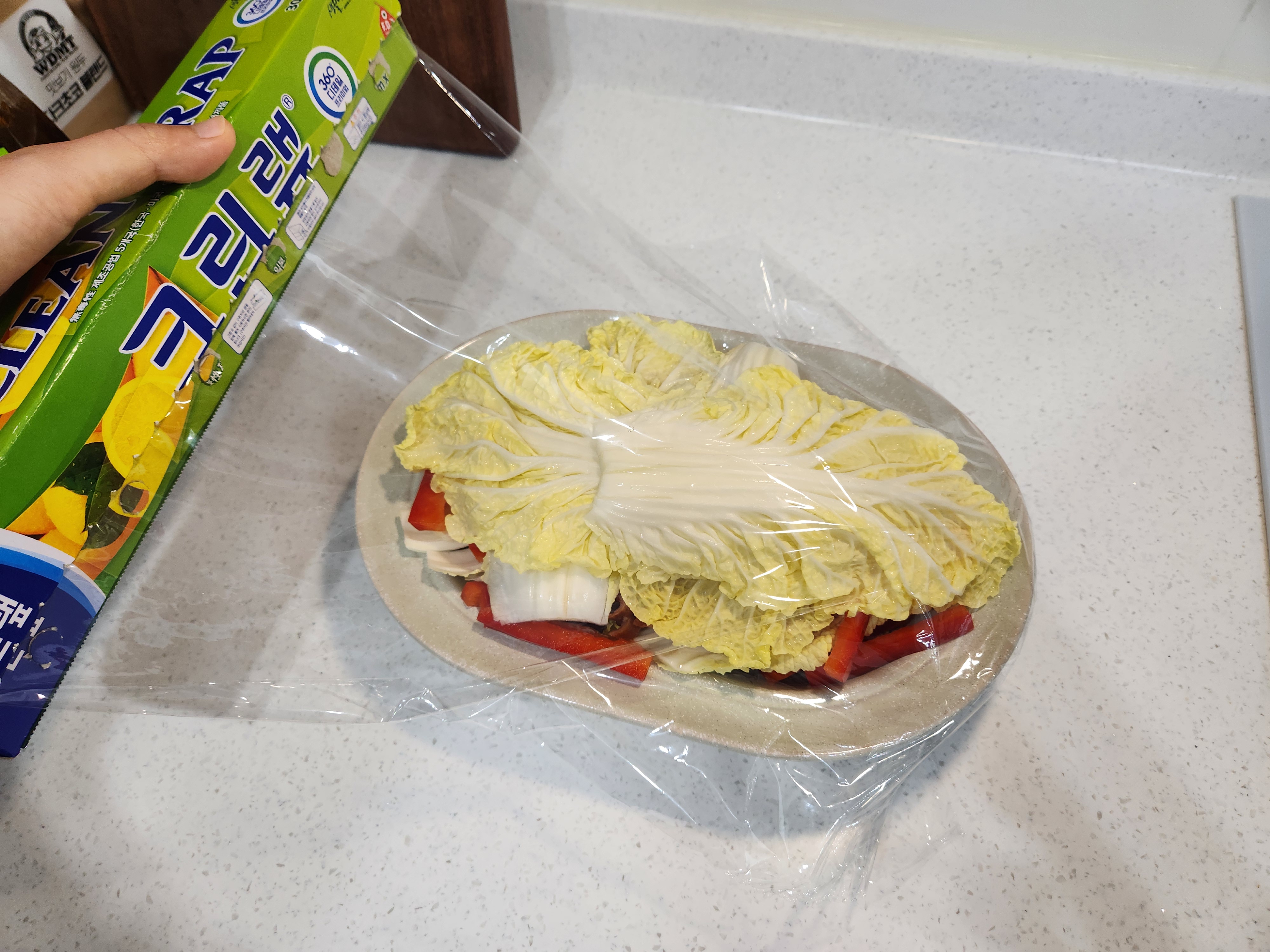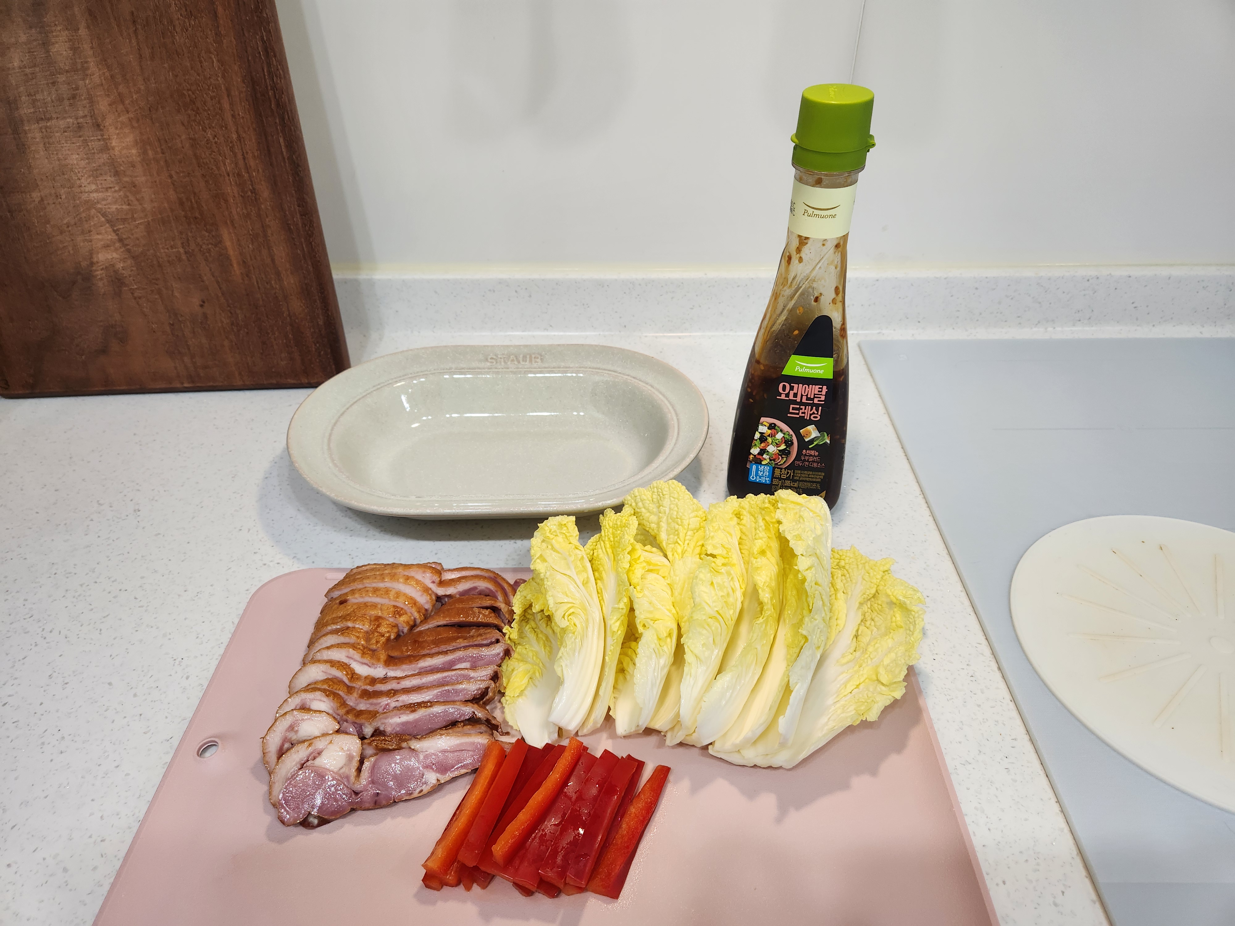 1. 훈제오리 180g과 알배추 10장, 기타 원하는 야채를 전자레인지용 그릇에 넣어주세요.