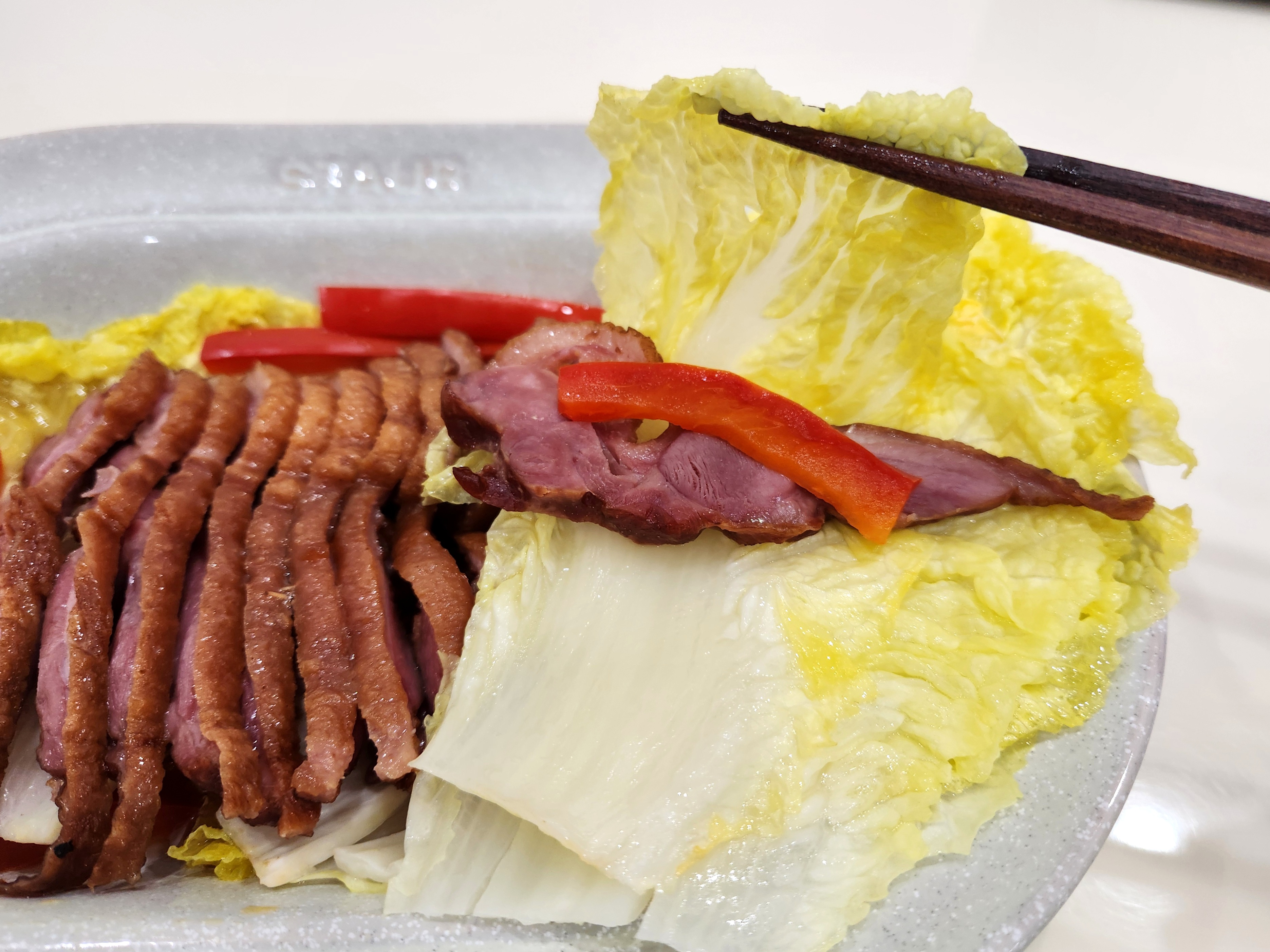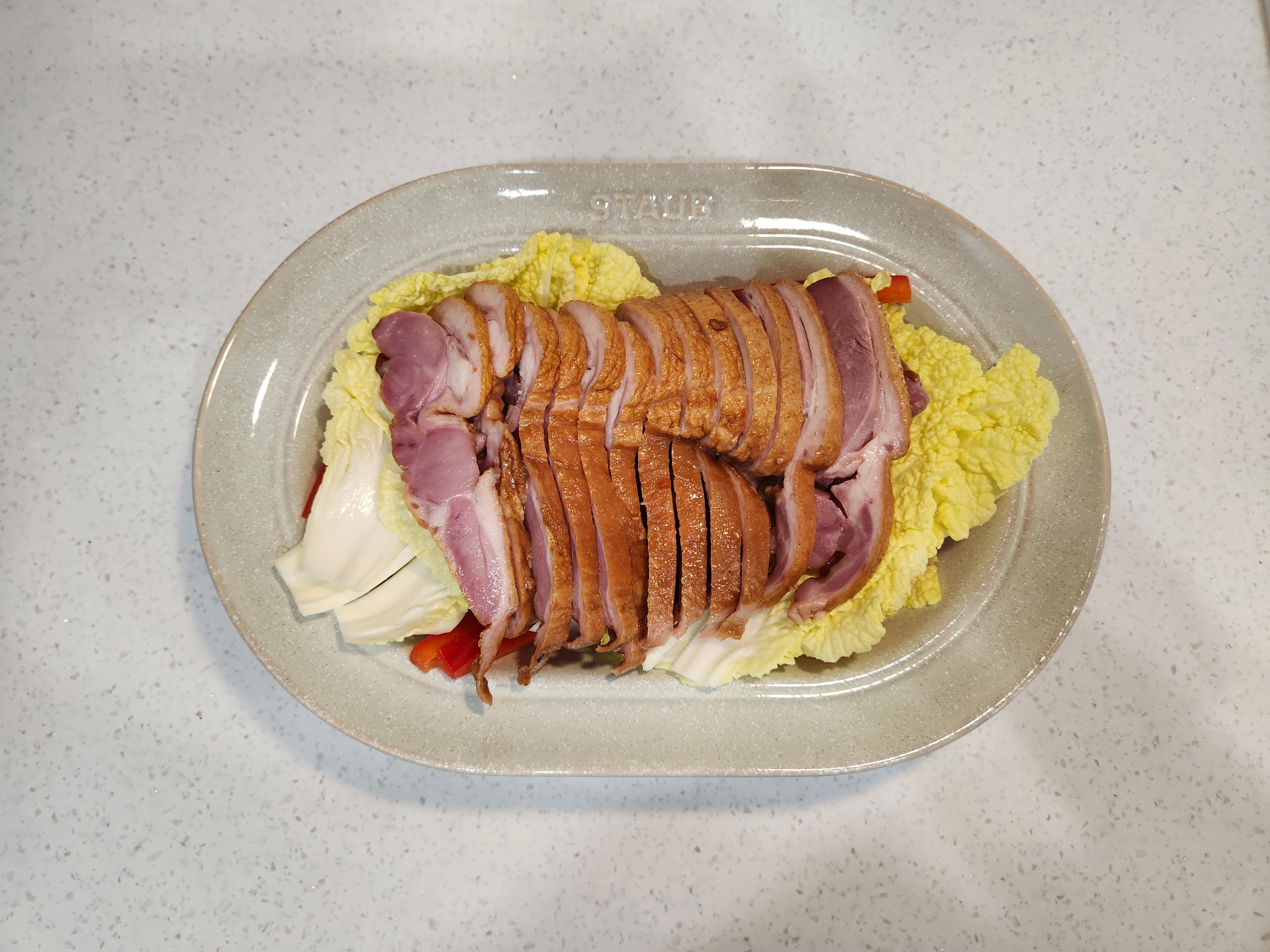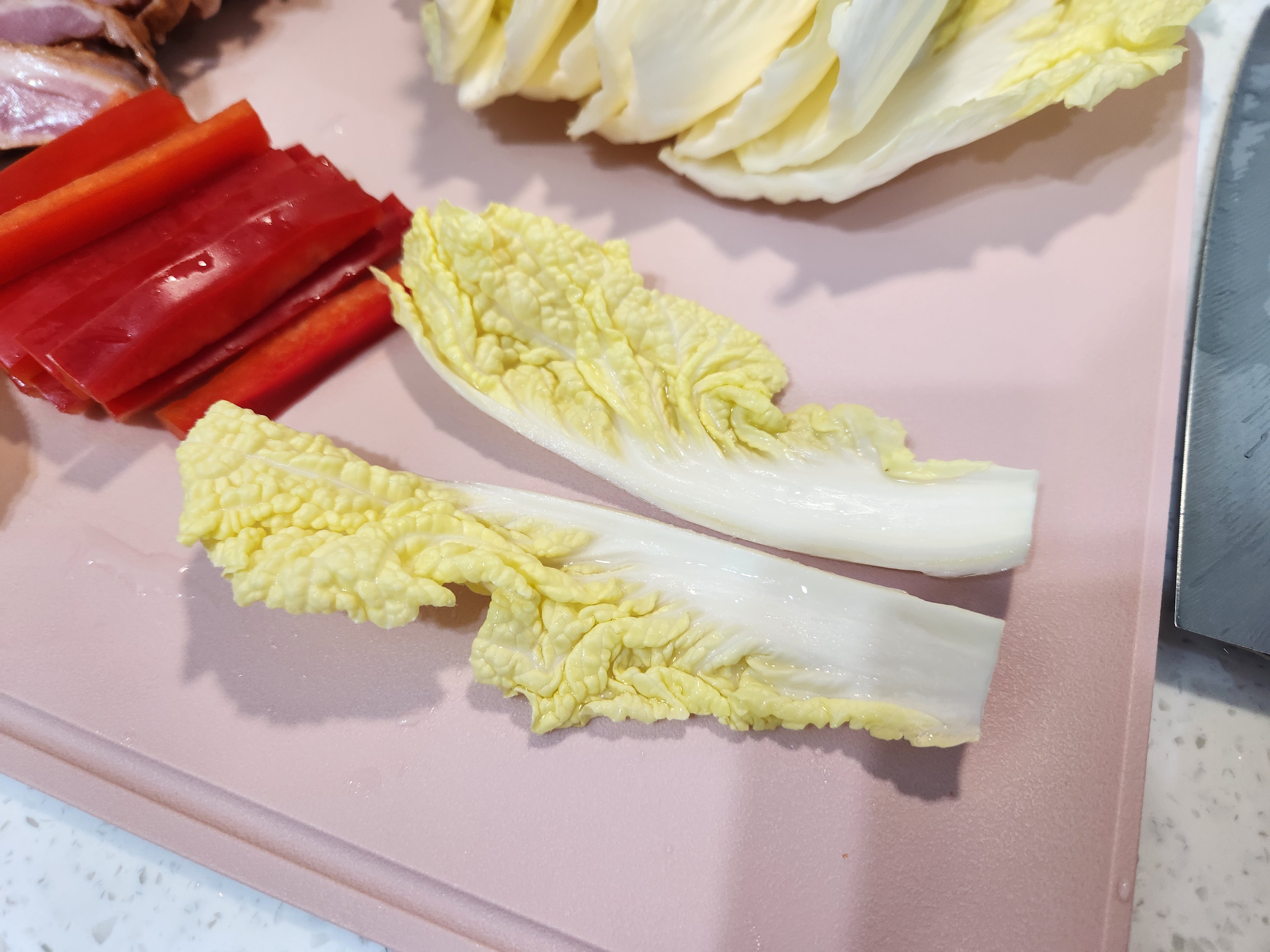 1. 훈제오리 180g과 알배추 10장, 기타 원하는 야채를 전자레인지용 그릇에 넣어주세요.