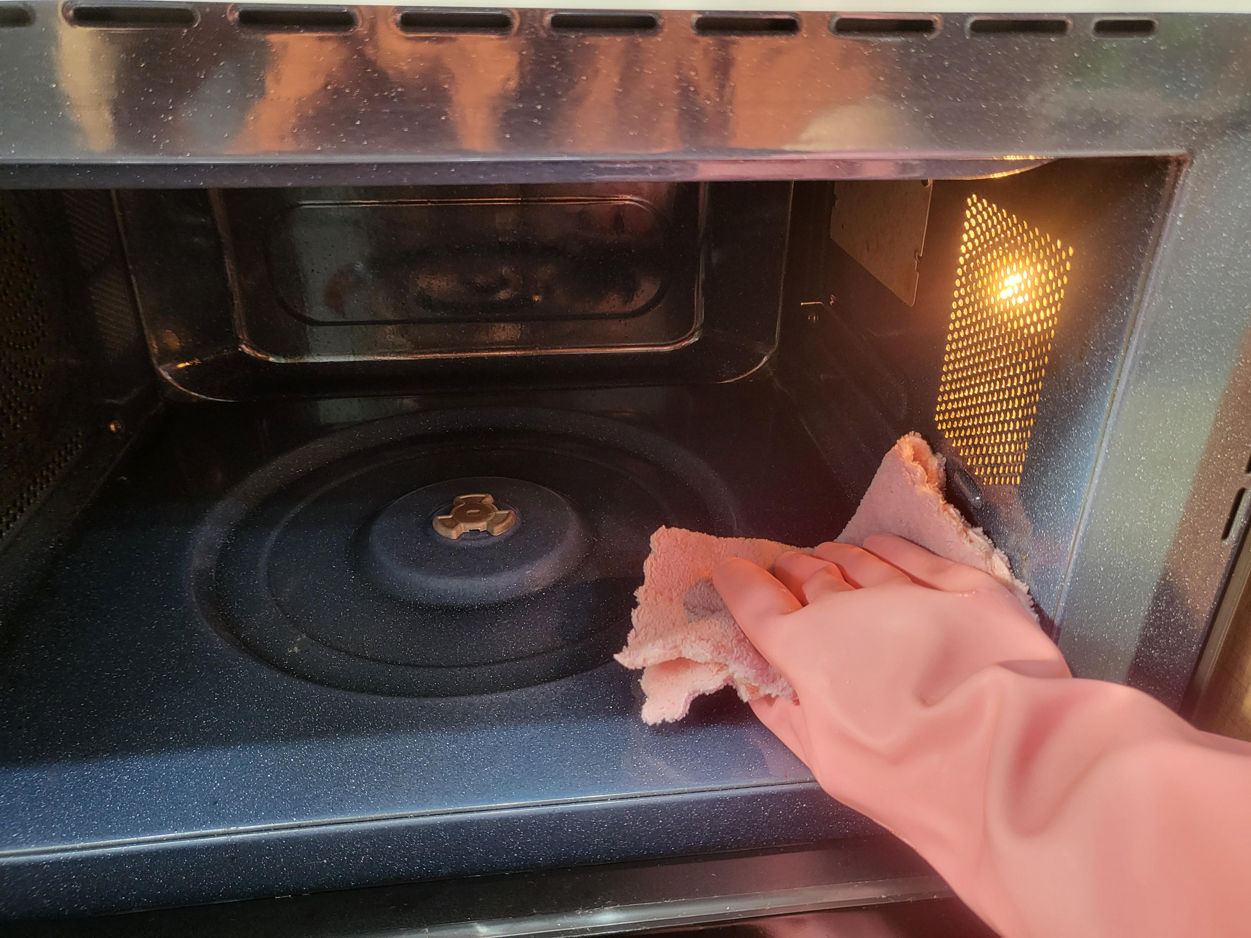 6. 전자레인지 내부는, 도톰한 행주를 이용해 꼼꼼히 닦아냅니다. (문쪽과 오븐 열선도 닦아주세요)