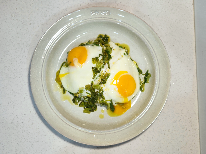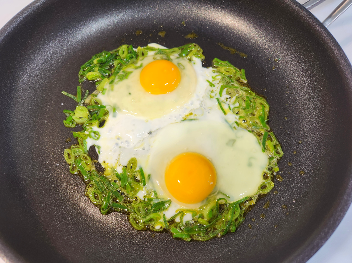 3. 볶은 파를 둥글게 펼치고 달걀 2개를 깨뜨려 구워줍니다.(소금 한 꼬집 뿌려주세요.)