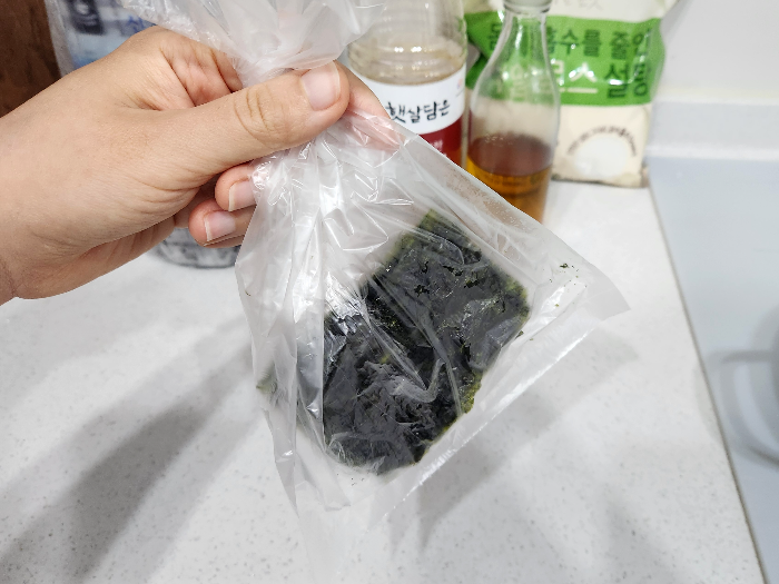 3. 김 한 봉지를 위생비닐에 넣고 잘게 부숴주세요.
