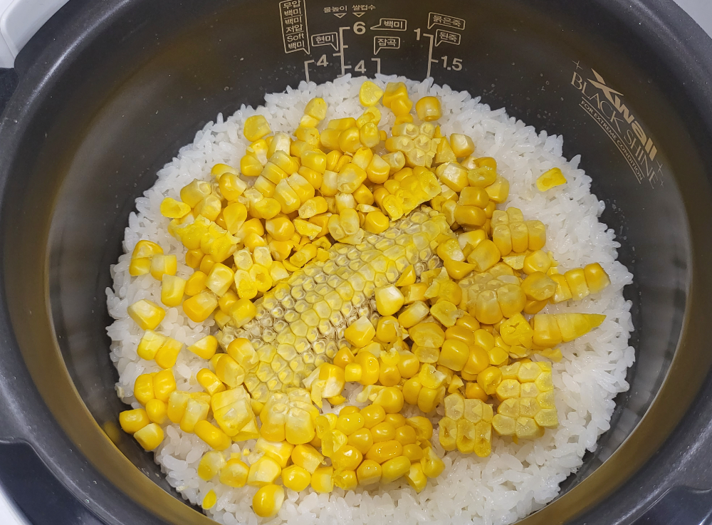 3. 밥이 거의 다 되어 뜸 들일 시간이 되면 전기밥솥의 뚜껑을 열고(오픈쿠킹기능 있을 경우) 미리 썰어둔 초당옥수수 낱알을 모두 넣고 약 10분 정도 뜸 들이기를 합니다. (오픈쿠킹기능이 없으시면, 취사 종료 후 낱알을 넣고 10분 정도 뜸 들여주세요.)