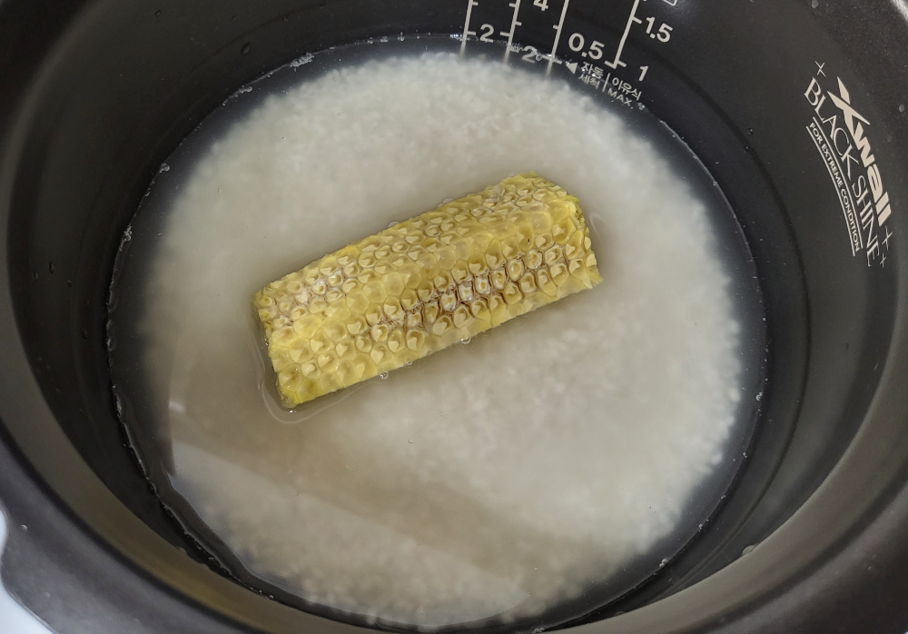 2. 깨끗이 씻은 쌀 2컵에 물 1.5컵을 붓고 밥솥 중앙에 초당옥수수 속대만 넣은 다음 전기밥솥으로 취사를 시작합니다. 옥수숫대가 들어가야 밥에서 달큰한 향이 나요~!
