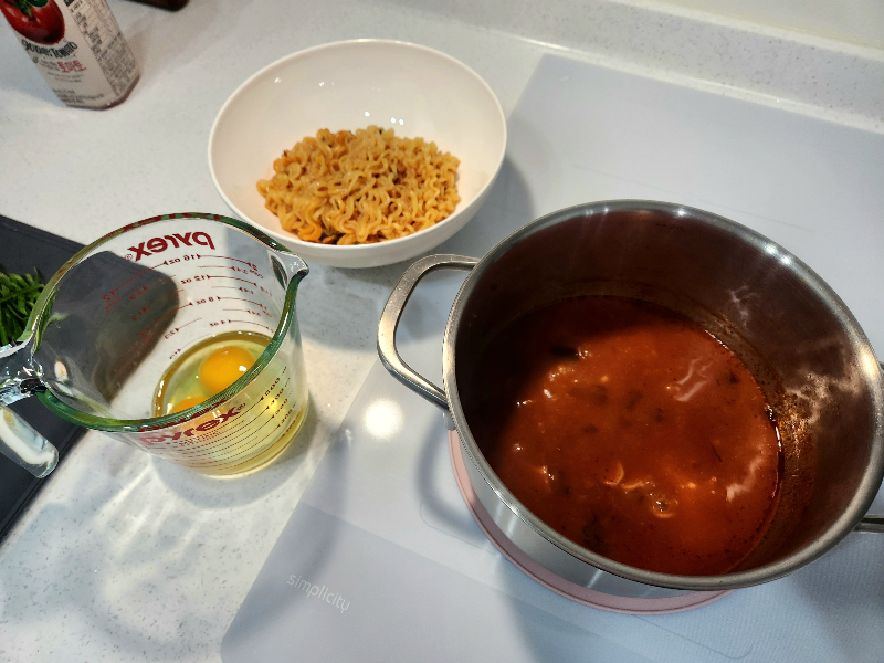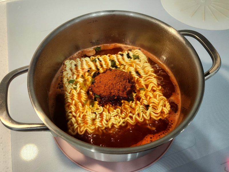 2. '물+토마토주스'가 끓어오르면 라면과 가루수프를 넣고 다시 끓입니다.